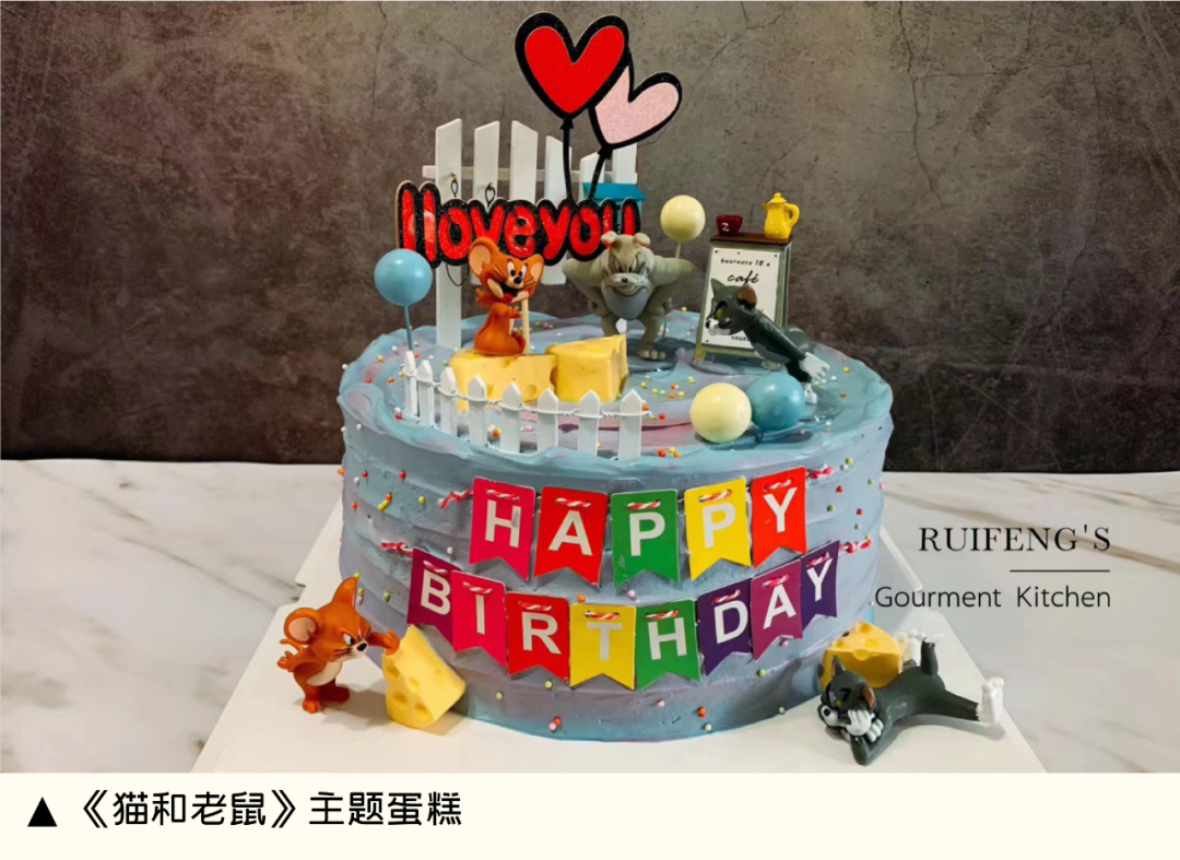 例如:“我要给7岁的儿子制定一个生日蛋糕,他喜欢动画片《猫和老鼠》,希望蛋糕是双层的,够10个人食用。”那么蛋糕的主题就出现了——卡通猫和老鼠的儿童风格全家型蛋糕。如何去切合主题并突出主题呢,就是要寻找重点元素,并围绕其进行突破。