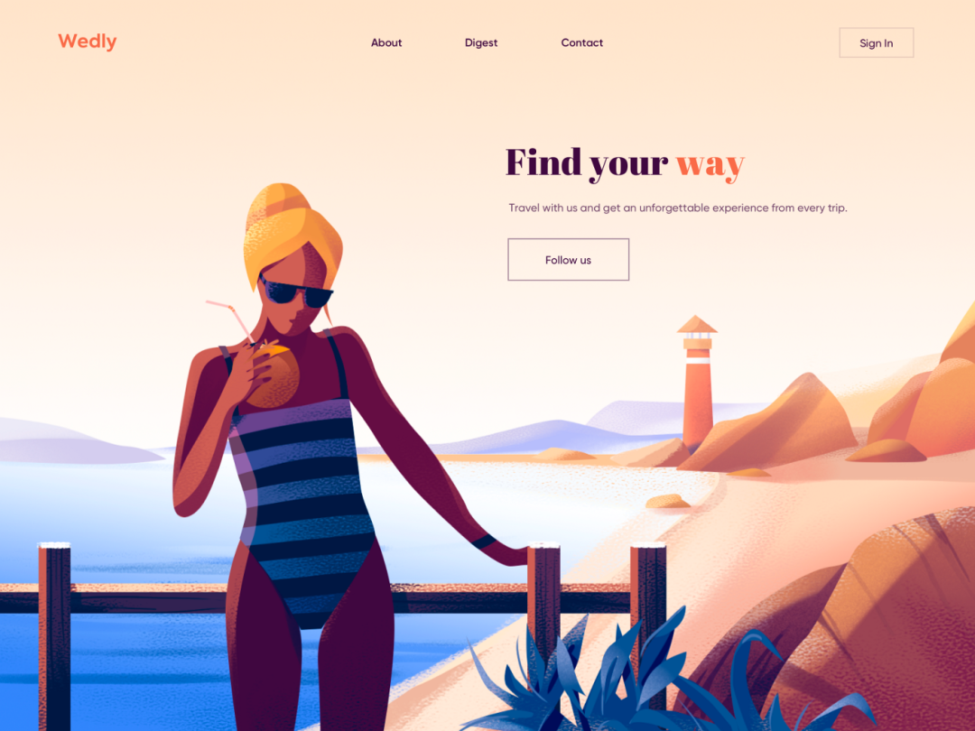 上图同样也是一个虚拟旅行网站,这个网站的设计同样漂亮,插画同样吸引人的眼球,不同点在于首页的可用性。这个设计不仅解决了问题,更清楚的表达了它在解决什么类型的问题,即帮助旅行者获得体验感更佳的旅行。这是一个用来帮助用户来计划旅行的网站,他所提供的的链接是清晰有效的,行动按钮的指向性也是易于理解的,因此这是一个好的设计。