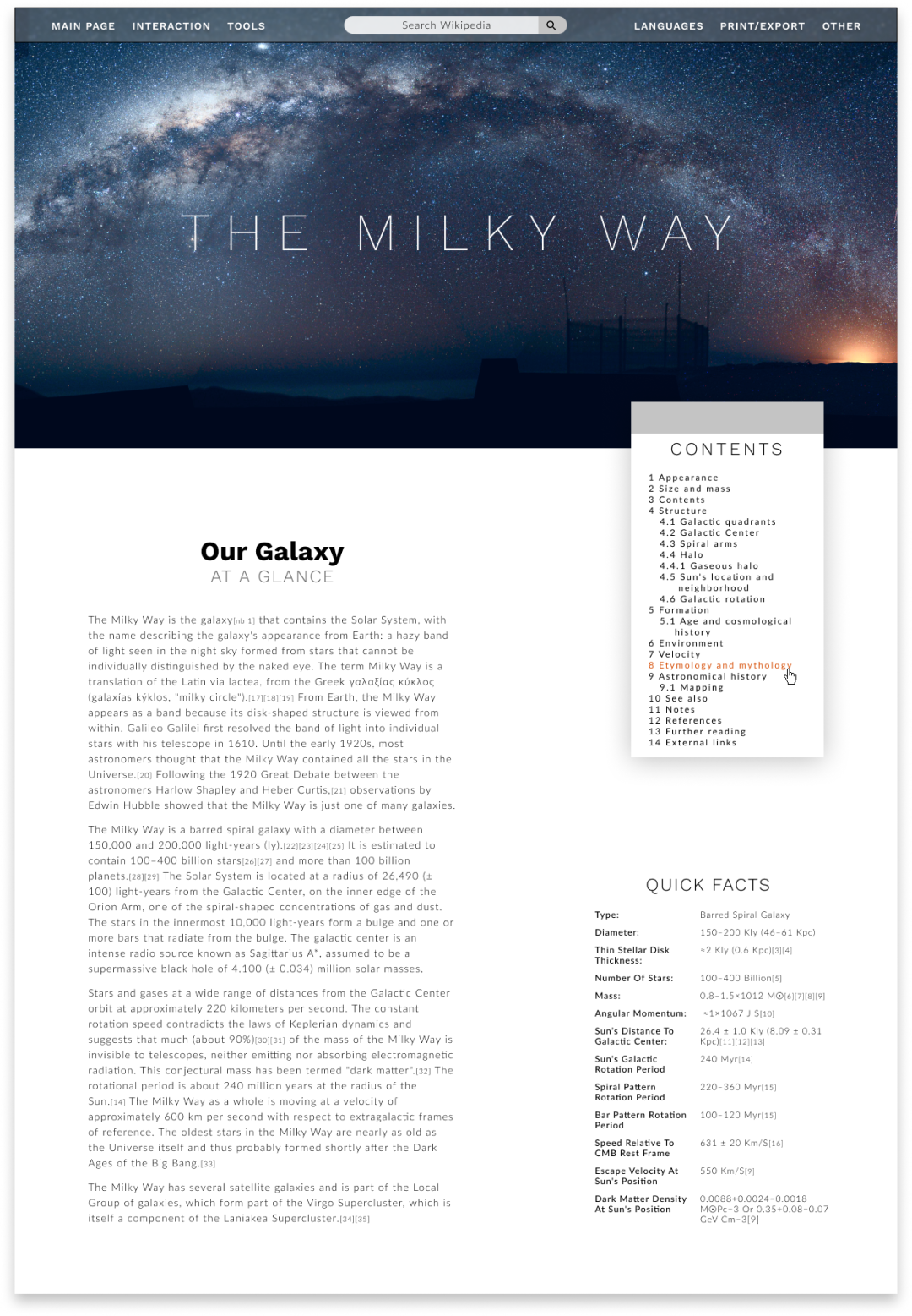 当我刚开始我的设计生涯时,我并没有很多设计经验。所以我在我的作品集中展示了一些业余时间的设计改版方案。其中一个项目就是重新设计维基百科,特别是这篇关于银河系的网页。