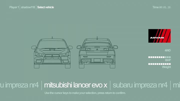 现在,就让我们来看看Colin McRace Rally 2。这款21年前的游戏UI与当时的预期完全不同。它的菜单设计呈现了一种简单、单色、极简主义的风格。这款游戏的菜单仅会显示绝对必要的信息,这样就使复杂的操作,例如调整车辆部件,变得更加容易。我们可以仅使用箭头键和空格键来导航结构良好的菜单系统。