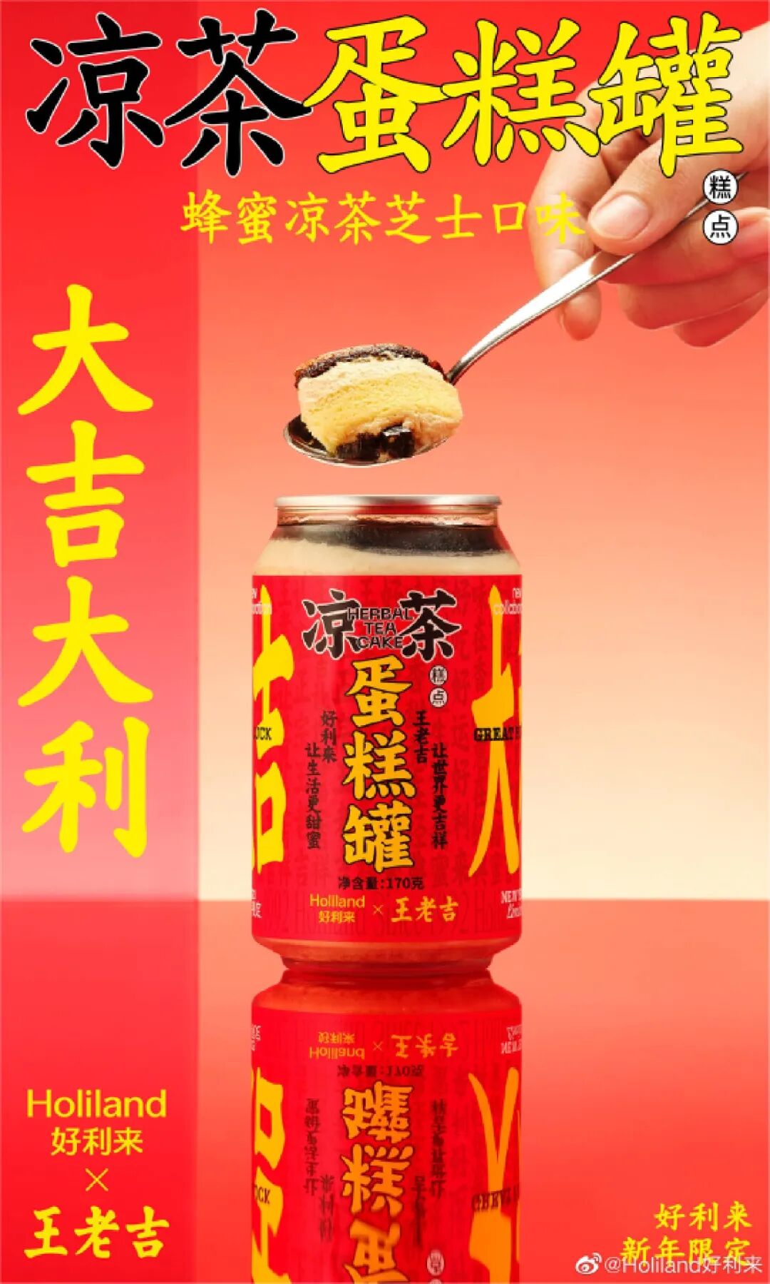为了更准确的呈现“祝你新的一年好吉了”的新春祝福,好利来彻底“变色”,王老吉的红黄配色在联名活动中唱主角,无处不在的“吉”字更是沿用了王老吉的表达习惯,以“图吉利”为名,无限“借题发挥”:一握吉起千层酥,人间极品;吉品口感,吉动人心,酥服了;四种口味,吉运交汇,吉祥如意,大吉大栗,好事成兔(Two),福星糕照……甚至化用了王老吉那句沿用多年的口号:“过吉祥年吃红罐好利来。”