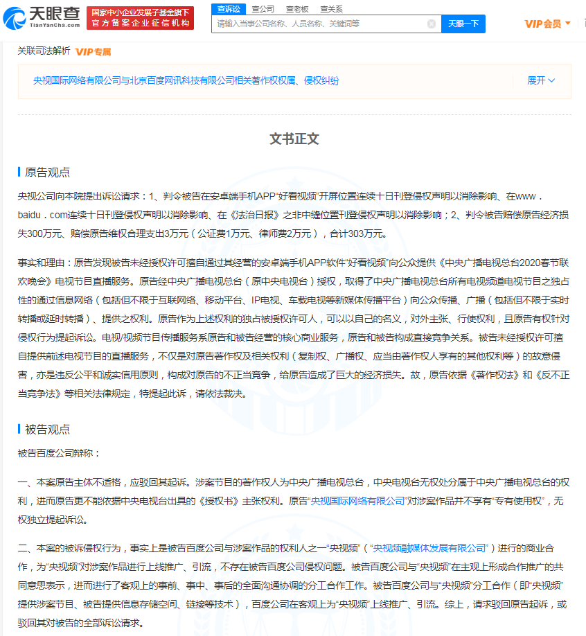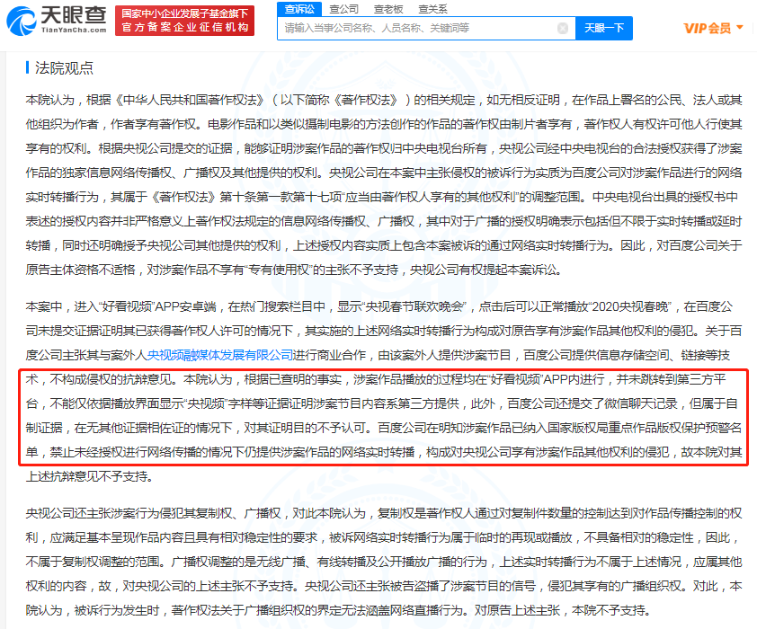 文书显示,原告央视公司诉称,被告百度公司未经授权许可,擅自在其经营的软件“好看视频”中向公众提供《中央广播电视总台2020春节联欢晚会》电视节目直播服务。被告辩称,本案被诉侵权行为是与涉案作品的权利人之一“央视频”进行的商业合作,不存在侵权问题。