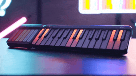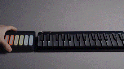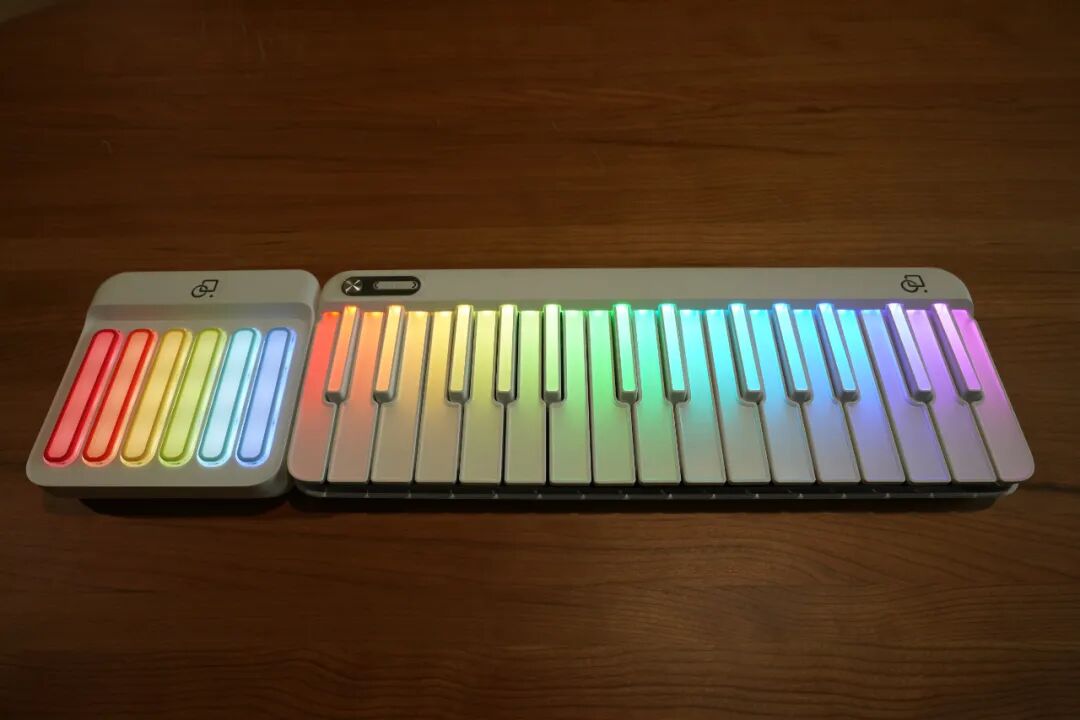 左侧为18键的和弦胶囊打击垫,可以将复杂的和弦用一键完成;而右侧则为拥有29键主音的钢琴键盘;当两者磁吸结合在一起,就变成了一个超级智能的智能键盘了~