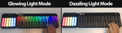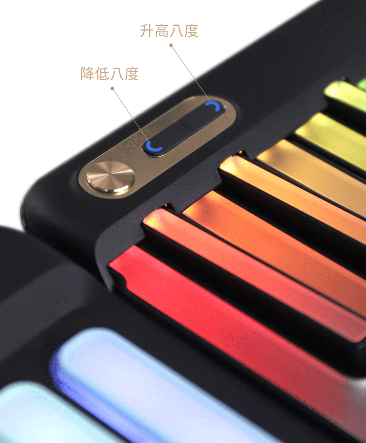 键盘顶部有两个按键,长按圆形按键开/关机,开机后琴键会瞬间亮起,科技感满满。