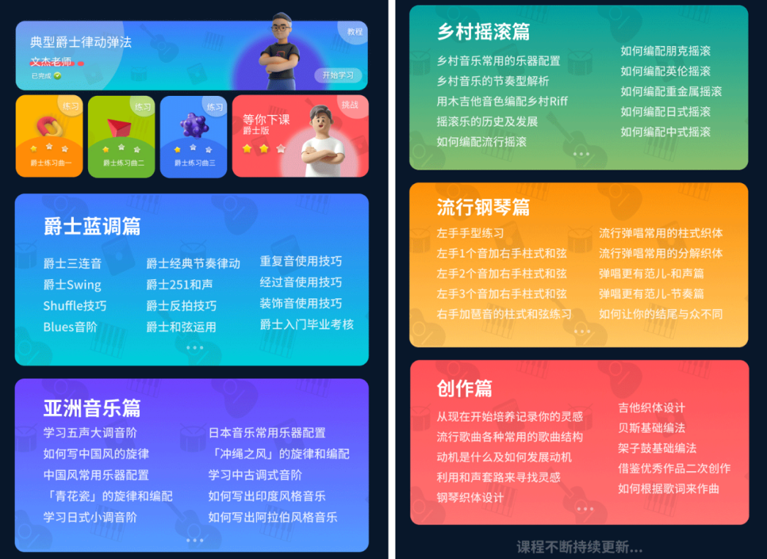 课程内容甚至还延伸到如布鲁斯、中国风、乡村、摇滚、电子乐等音乐风格的讲解,并针对性的将每组节奏和弹法知识点的小技巧,改编为游戏练习,让你轻松掌握各种世界音乐曲风。