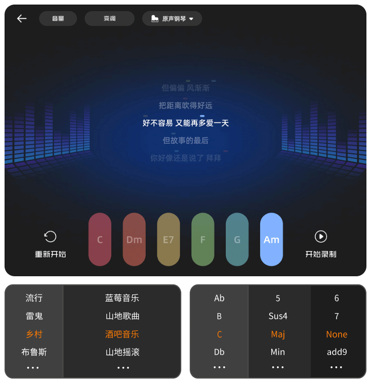 选择App中的Freeplay功能,还能进行自定义编曲、弹唱、录制,创作属于你自己的旋律。