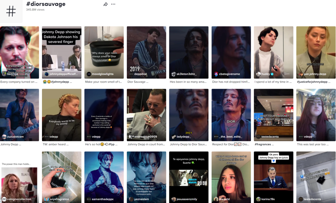 Tik Tok上#diorsauvage话题主页几乎是为德普的照片,该话题相关视频已被观看近3.5亿次。