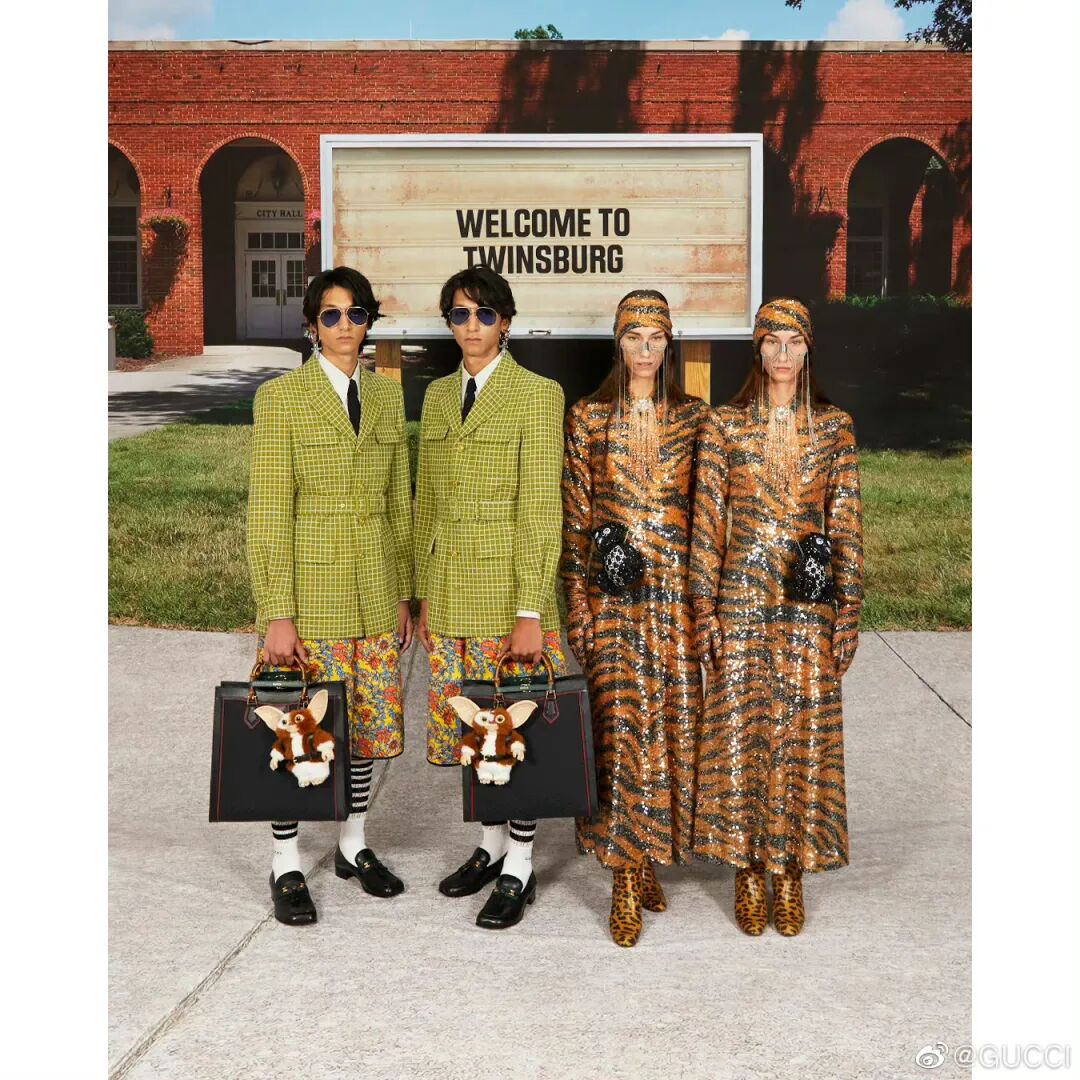 本季系列以 Gucci Twinsburg 为名,是对著名双生城 Twinsburg 的致敬,这座位于美国俄亥俄州的小城每年都会举办双胞胎节。本季大秀上,Gucci 找来 68 对双胞胎模特们换上相同秀服,在镜像般的呈现中捕捉时尚韵律。本季服饰融入多重文化,包括中国风的旗袍、肚兜、盘扣元素以及桃花、锦鲤、竹子等刺绣工艺,西装剪裁也颠覆了传统想象,以镂空设计带来上装与下着的鲜明反差。