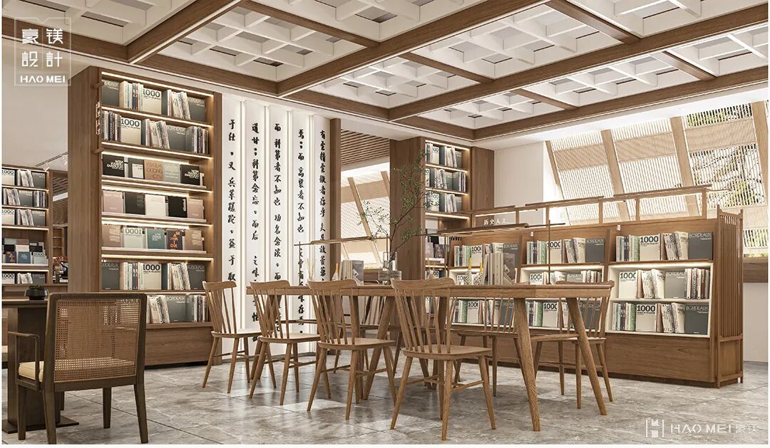 阅读区的复古实木桌、同色系靠椅,搭配绿植盆栽,背景墙、隔断墙由书架打造而成,极具特色。呼应全店园林气息,配以文赋书法屏风,书盈四壁,文山书海,提升整个空间的校园氛围与人文气息。