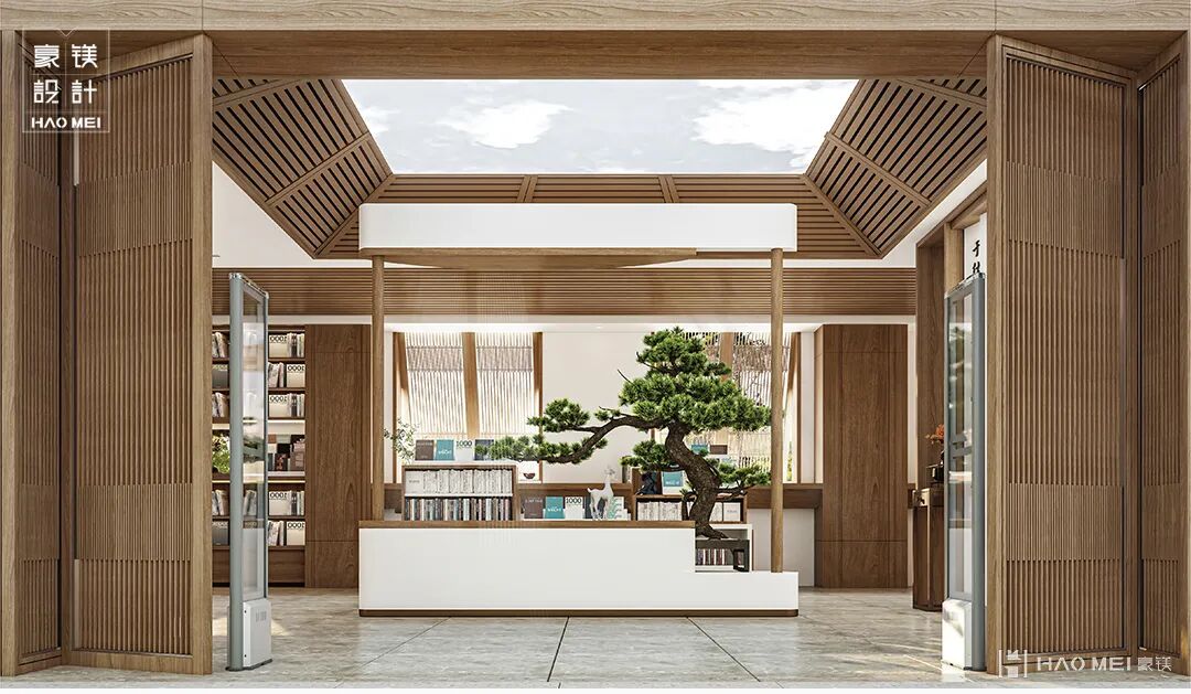 仁德中学书店以【中空栅栏+定制天花】重构“天井”元素,融合现代美学,体现“四水归堂”的人文理念与设计智慧。把传统建筑手法与前厅天花形态特点相结合。结合当地文化特色与校园店的文教属性,专门设置了形似“书斋”“天井”的园林式室内特色区域。