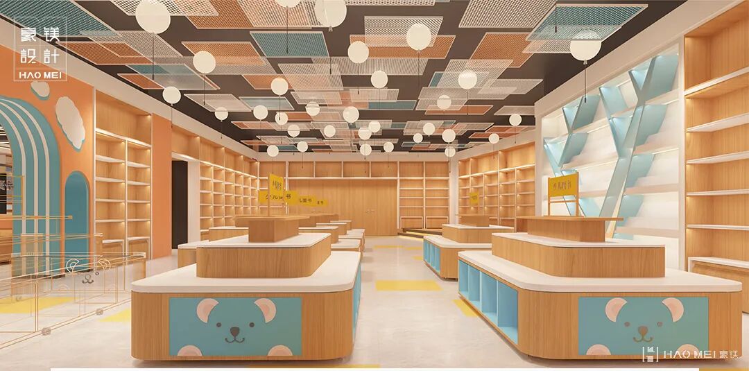 这里是孩子们心灵的游乐场和补给站,设计师给儿童预留了足够大的空间。以童言筑梦馆作为儿童阅览区的门头,浅黄搭配温馨蓝,设计师为孩子们开启了一个探索未来,筑造世界的梦想天堂,孩子们携手可爱的蓝色熊宝宝在这有限的空间里展开对宇宙无限的思索。