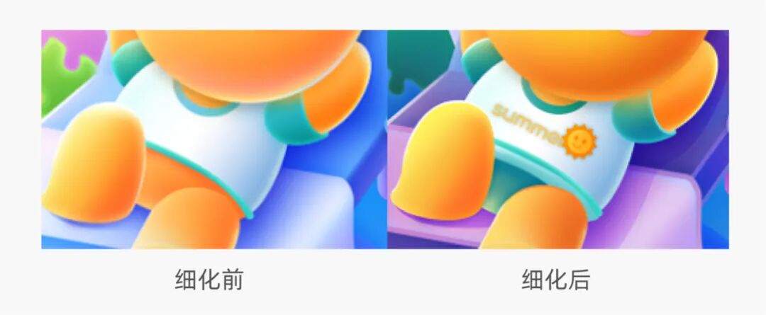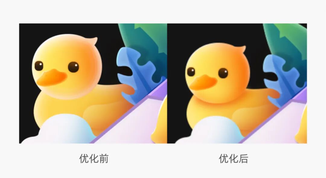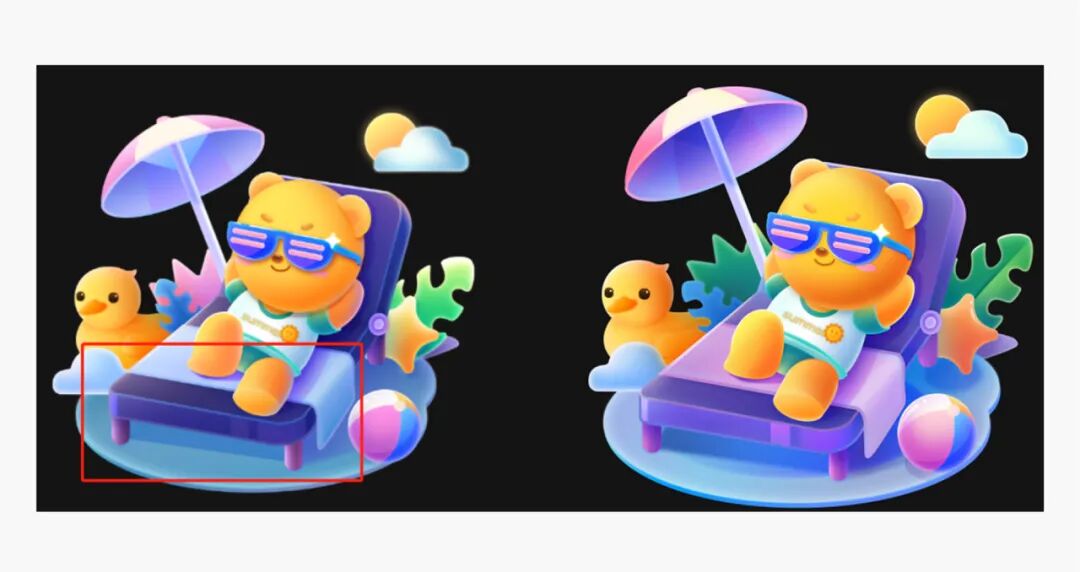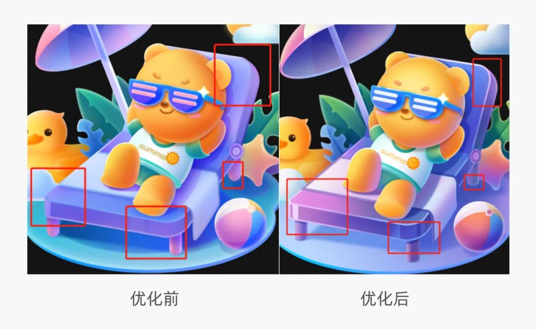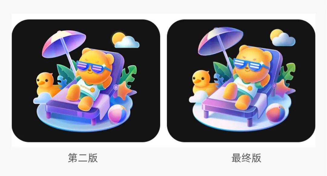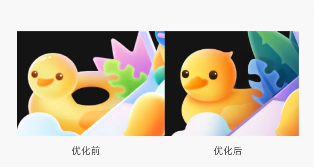 鸭子的造型我们把游泳圈直接改成了小黄鸭漂浮物,游泳圈中间的镂空让视觉看起来不够紧凑,同时我们也优化了鸭子的眼睛和嘴巴,让鸭子看起来更精致一些。