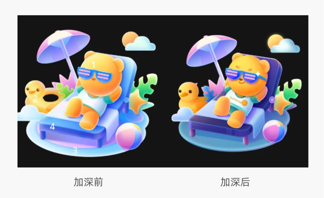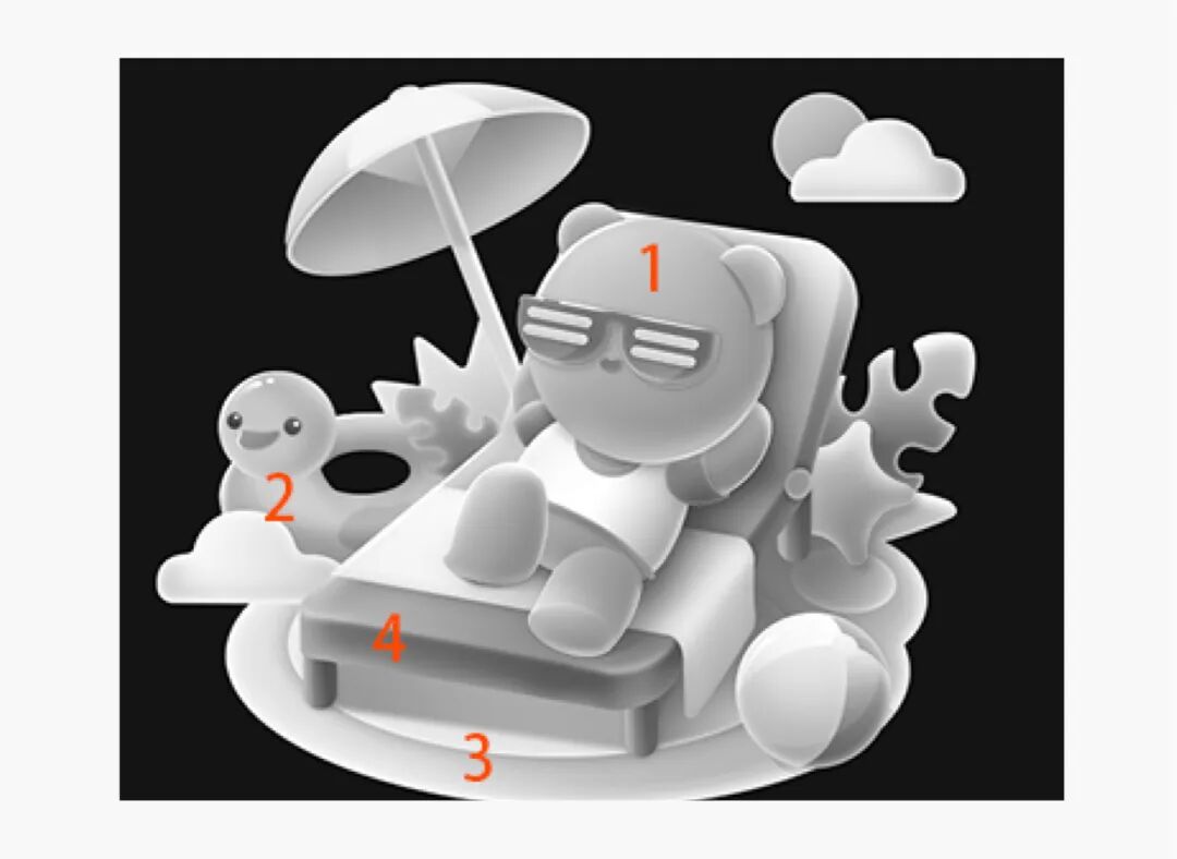 我们可以把整个小场景的明暗做一个区分,最亮的是熊,然后是鸭子,然后是地毯,最后是椅子,椅子作为地毯和熊之间的一个暗部,可以让画面有一个明暗的节奏,同时和熊的主体形成对比。