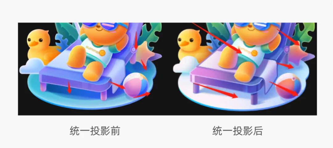 注意落地点,不要让影子浮在半空中,就像之前床的影子和星星的影子过于飘,整个物体看起来都没有落地。