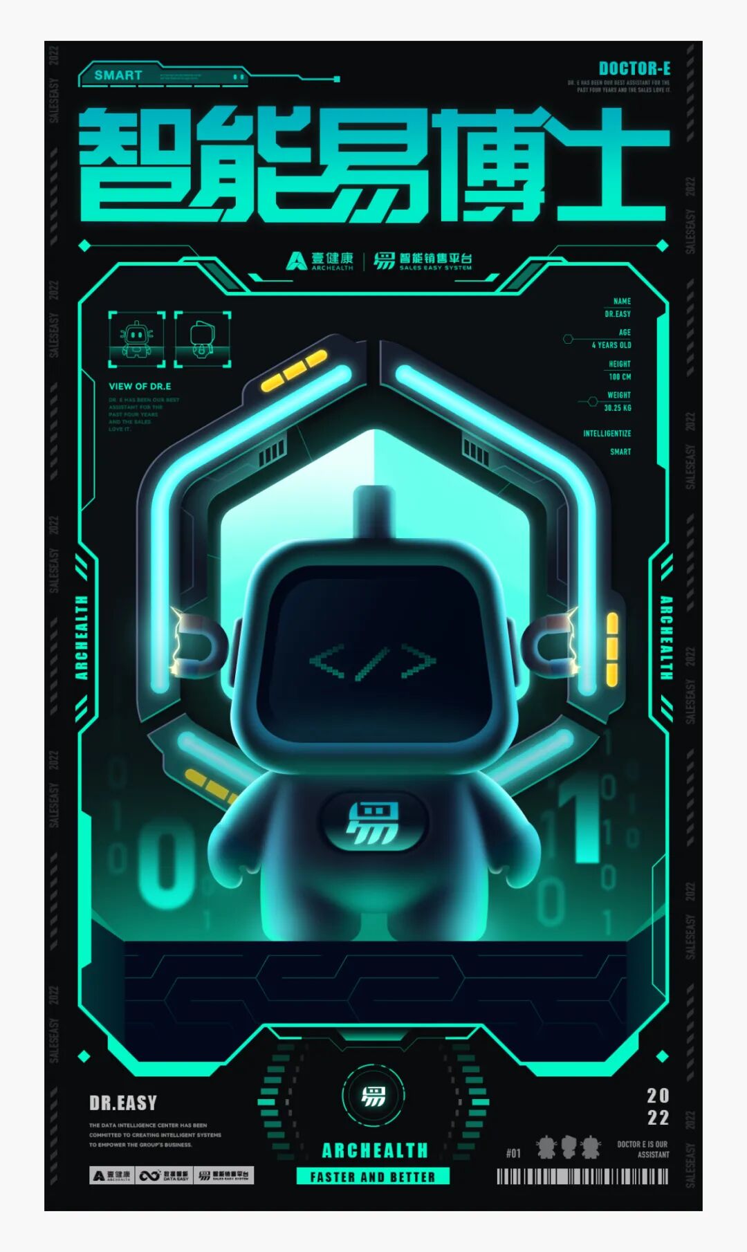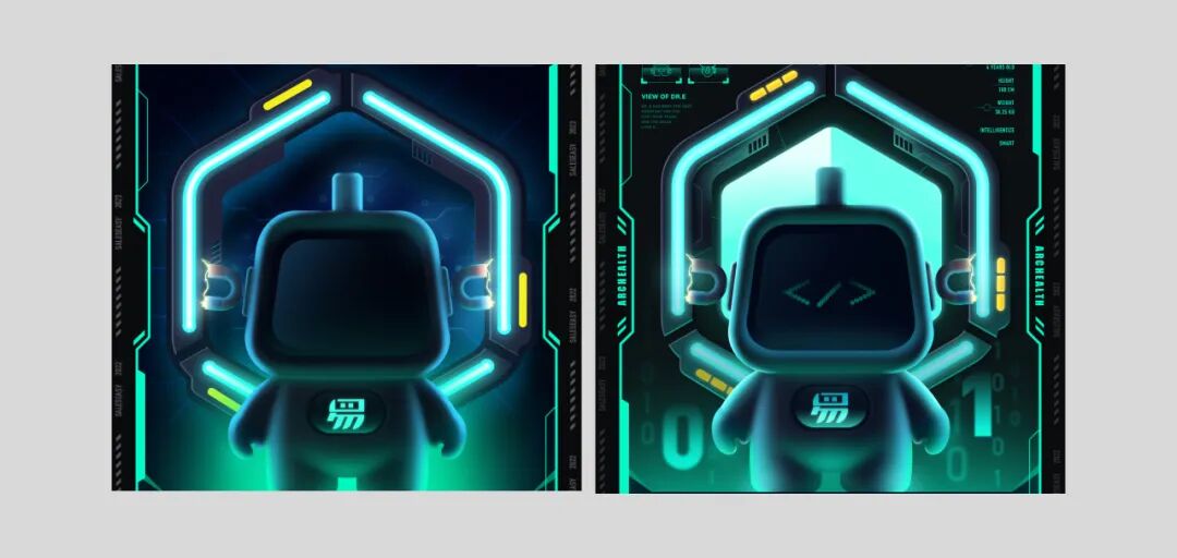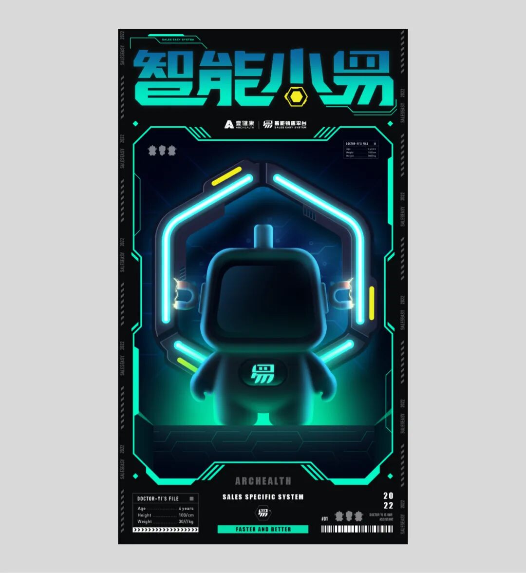 整个强化了画面的绿色,以绿色为画面主色调,框和文案都使用了绿色。一下就有一种很科技的调性在里面了。