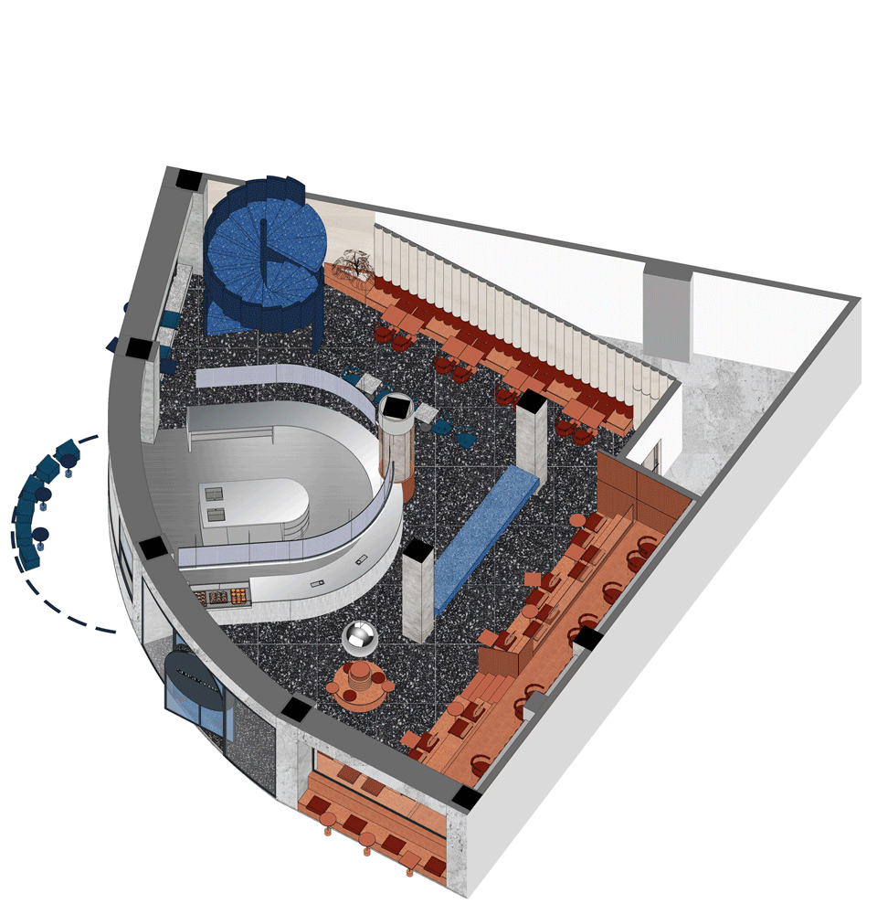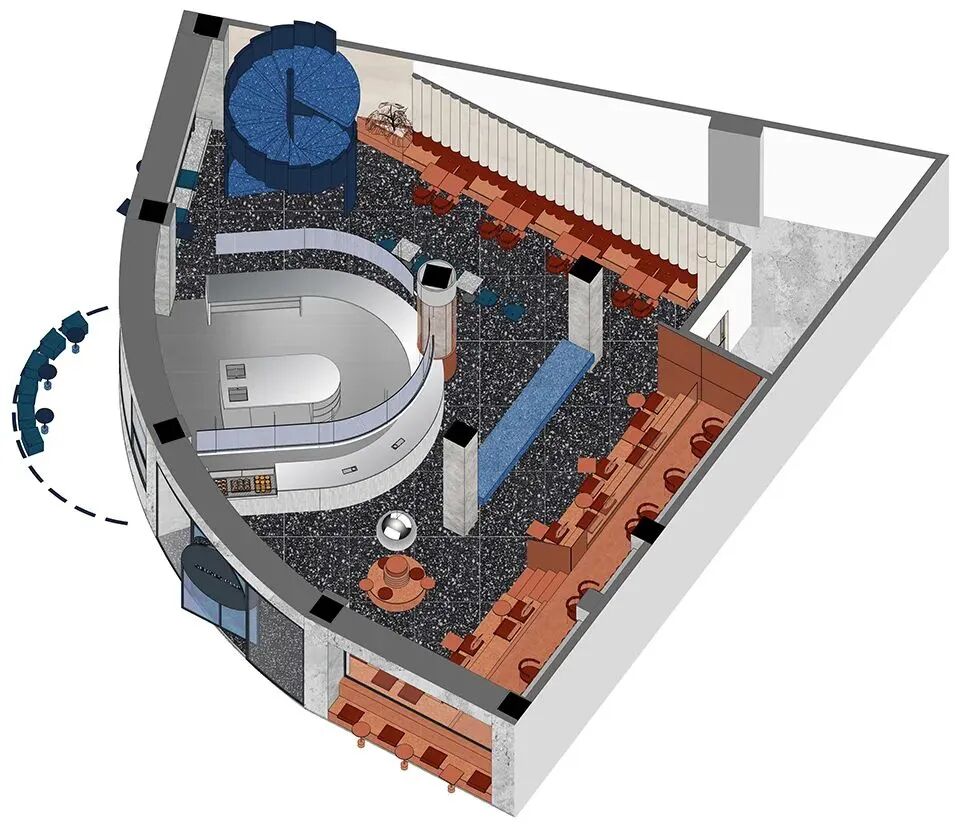 本案位于慈溪市新城大道北路,原生空间处于新城大道北路与北二环东路交叉处,形成独特的扇形结构空间。设计师用衍生结构(emergent grid)的概念作为切入点,借街角地理位置的优势,使两块实体空间在交叉中形成新的几何区域。借助这块扇形空间特有的几何结构和特性,在空间内部进行大规模环绕式设计。