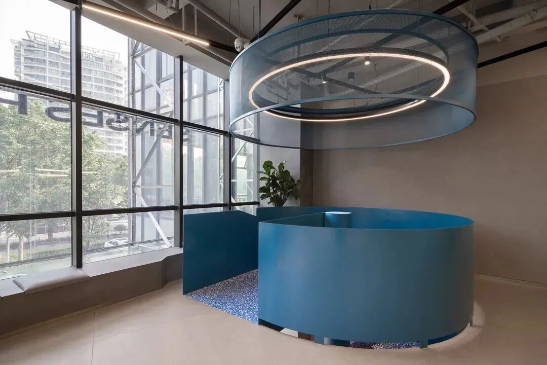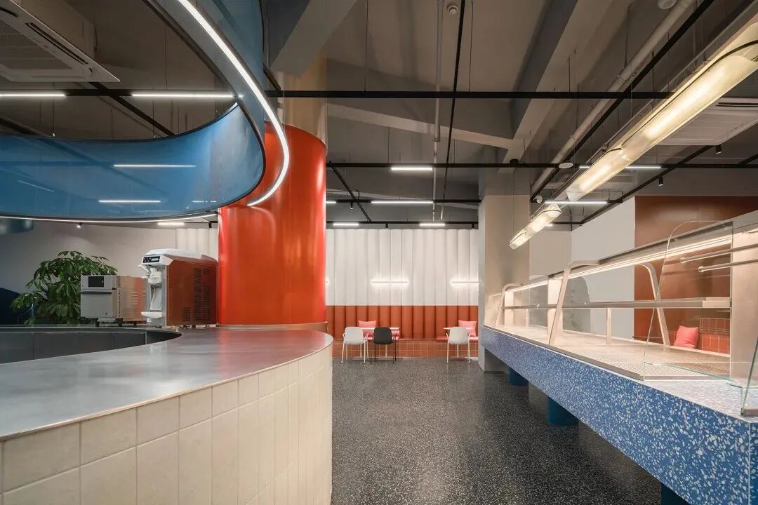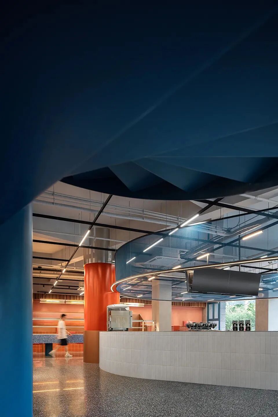 关于二层,强调材质选取对于内部空间延展的重要性,它使建筑物“非个体化”,金属材质调和了明亮色彩带来的视觉过曝,释放沉静稳定的情绪,形成具有鲜明特性的场域。