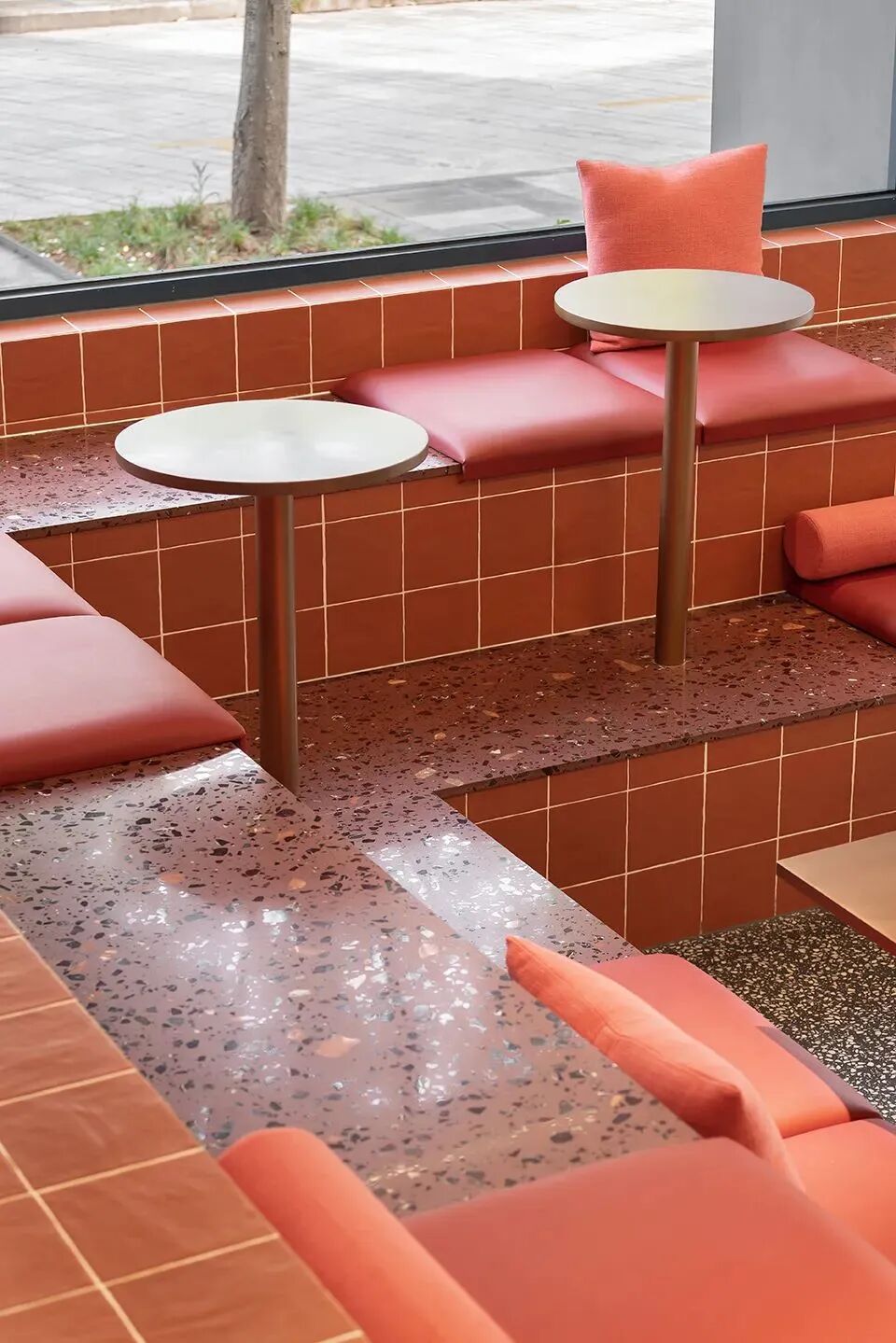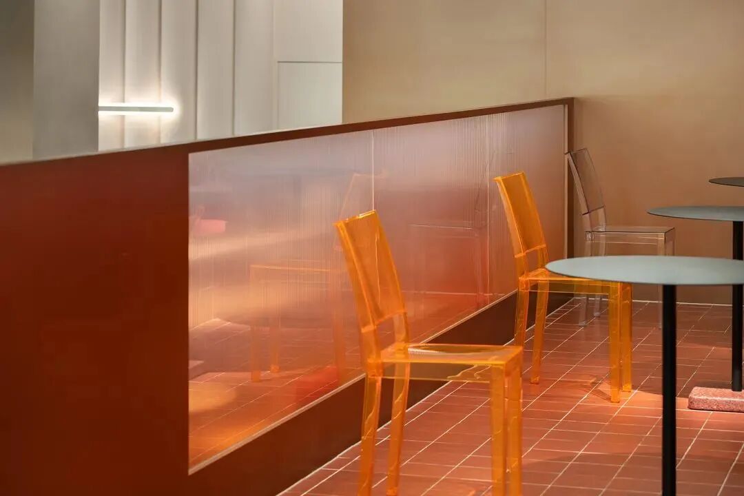 ▼塑料材质的客座采用色彩明快的亮橙色减轻空间沉闷感 ©YCL