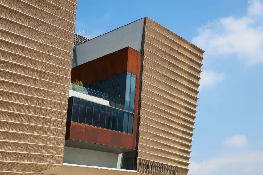 所以它的工业风格是比较重一点,当然有一些香港本土元素在里头。整体是倾斜的,上面大下面小,所以它声音可以环绕,空气流动比较好,对于保存藏品是一个很大的优势。