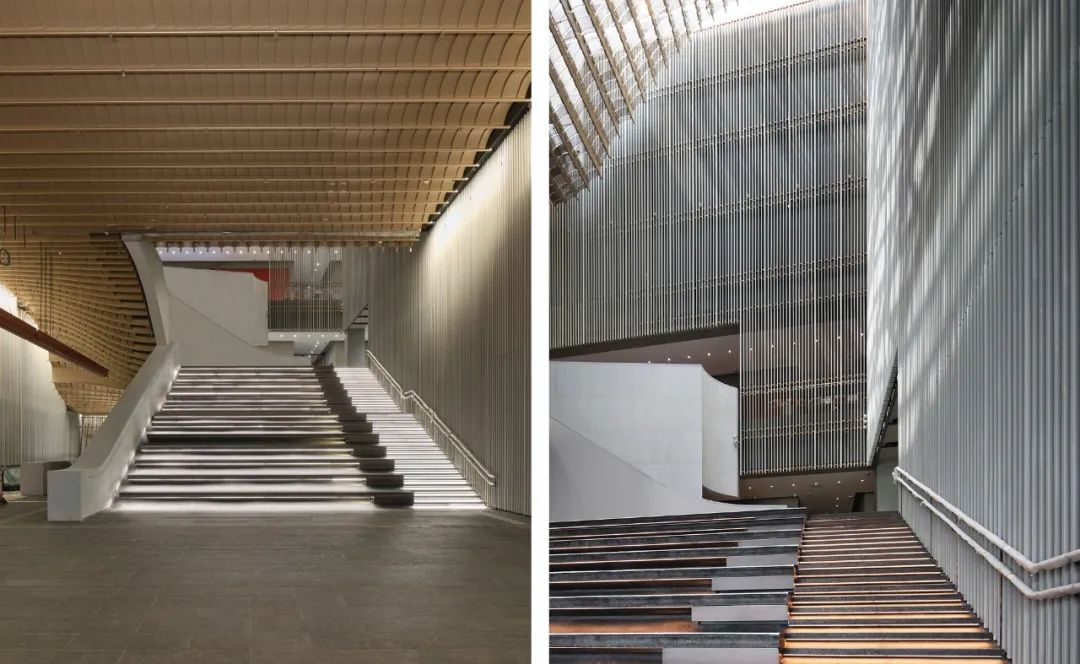里头可能感觉比较新奇,天花是铝作的,参考紫禁城琉璃瓦的形态,变成动态的天花,好像衣服上珠链的感觉,天光透进来之后中庭里是非常漂亮的。