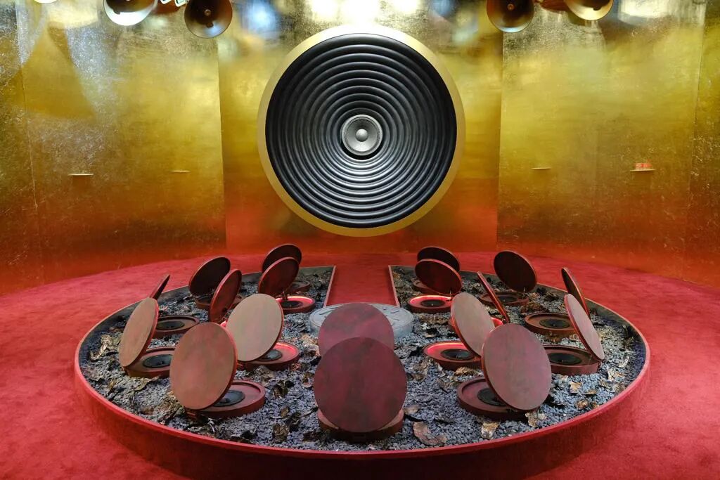 《庆》的灵感来自香港故宫所展出的宫廷乐器“金钟”和“玉磬”,作品的结构创意来自于香港的节庆烟花汇演,通过 31 条声道的音响设备和 12 种音效来呈现这一盛会。