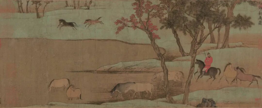 这件作品是赵孟頫五十九岁时画的,结合了唐代经典的鞍马画和青绿设色山水,是赵氏晚年代表作。后收入清宫,1920 年代被携至宫外,1946 年在天津溥仪旧宅被发现,后由故宫博物院接收。