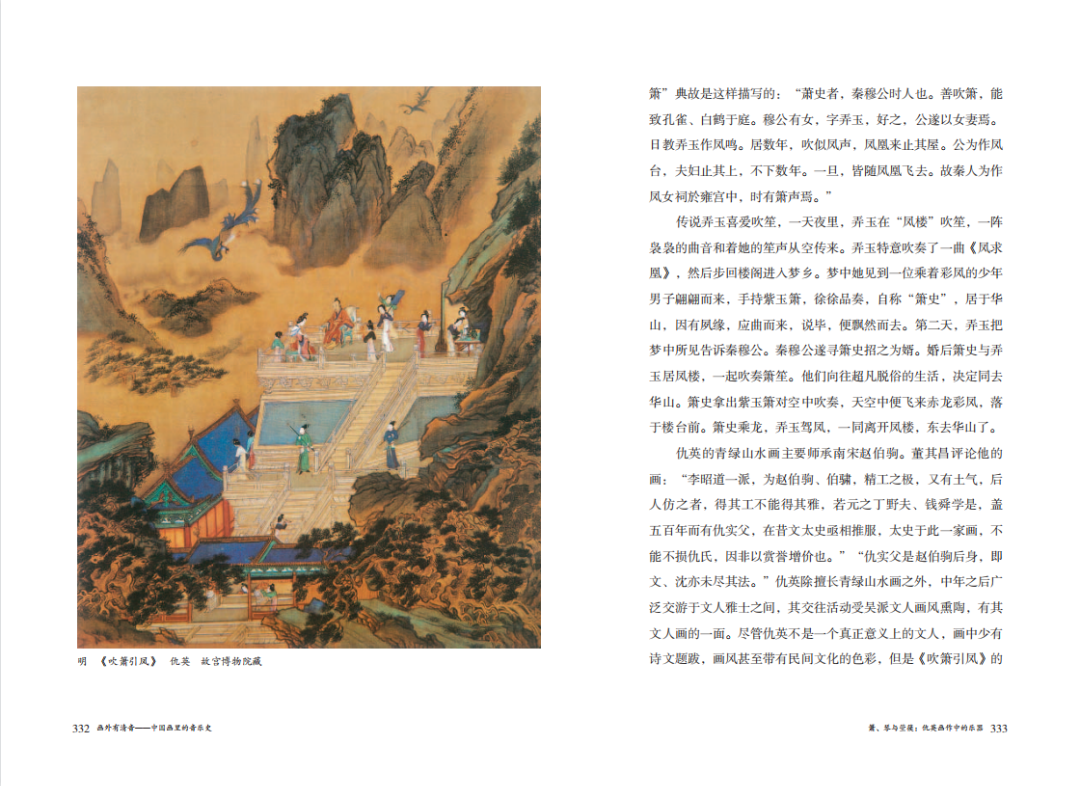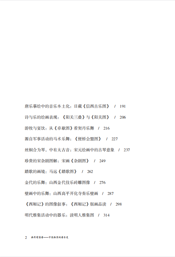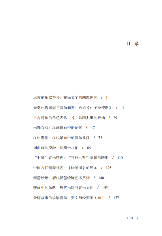从青铜绘饰、画像石、画像砖到墓葬壁画、石窟壁画、文人绘画,从史前 5000 年以来远古人类遗存的哨、笛、埙、磬等乐器图像,上古文明繁盛之期的礼乐教化、《箫韶》《九歌》与诸子胜迹,到汉唐时代的乐舞百戏、鼓吹、经变、伎乐和琵琶声声,宋元明清时代的杂剧、元曲、说唱、复古雅乐和各具特色的少数民族乐舞,作者都事无巨细、娓娓道来,图像爱好者、音乐爱好者,甚至于诗词爱好者,都可以在其中找到有趣的历史故事与史料实证。