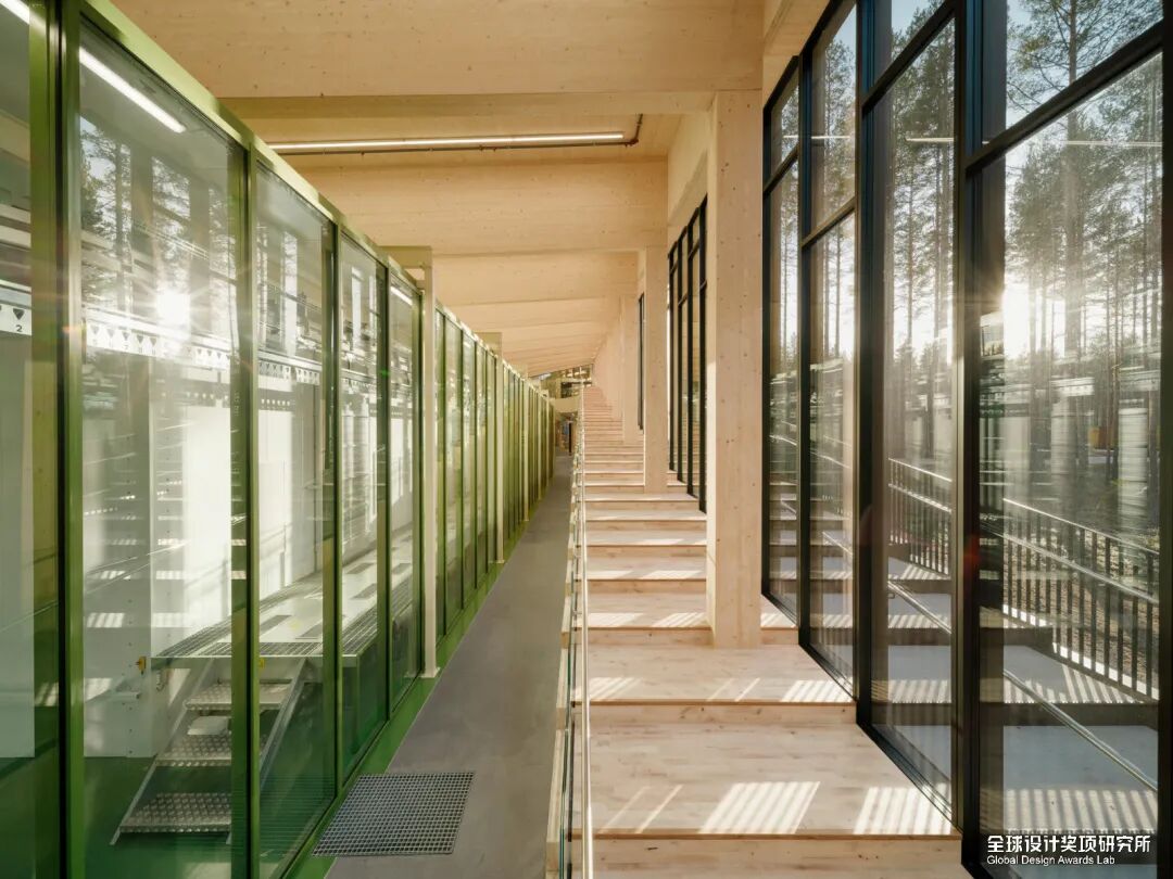 工厂屋顶被茂密的森林植被所覆盖,这些天然植被将与为建筑提供能源的太阳能电池板共生共存。屋顶将全年对公众开放,在这里,游客们可以近距离接触工厂,了解家具的生产过程,同时体验周边森林环境的自然之美。建筑的每个侧翼都设有大面积的开窗,让人们在一天的任何时间内,都清晰地可以看到工厂内的所有部分。周边的松树林中设有大型步道网络,穿越树林后,游客还可以沿着室外坡道登上工厂屋顶,并在沿途俯瞰建筑内部与美丽的松林。