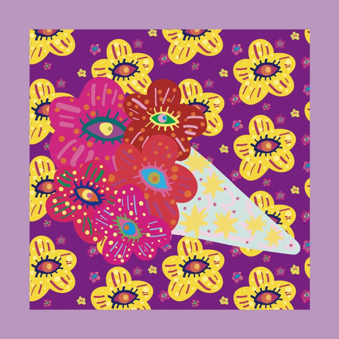 花,作为“宇宙花花大爆炸”展览的绝对主角,不仅寓意着自然中的点滴美好,亦是创作者本人世界观、价值观的浓缩。因此,不管是为艺术社区增色的玻璃钢雕塑作品、气膜作品,亦或是诙谐幽默的版画作品,FAFA透过不同的载体传达着积极乐观的态度。