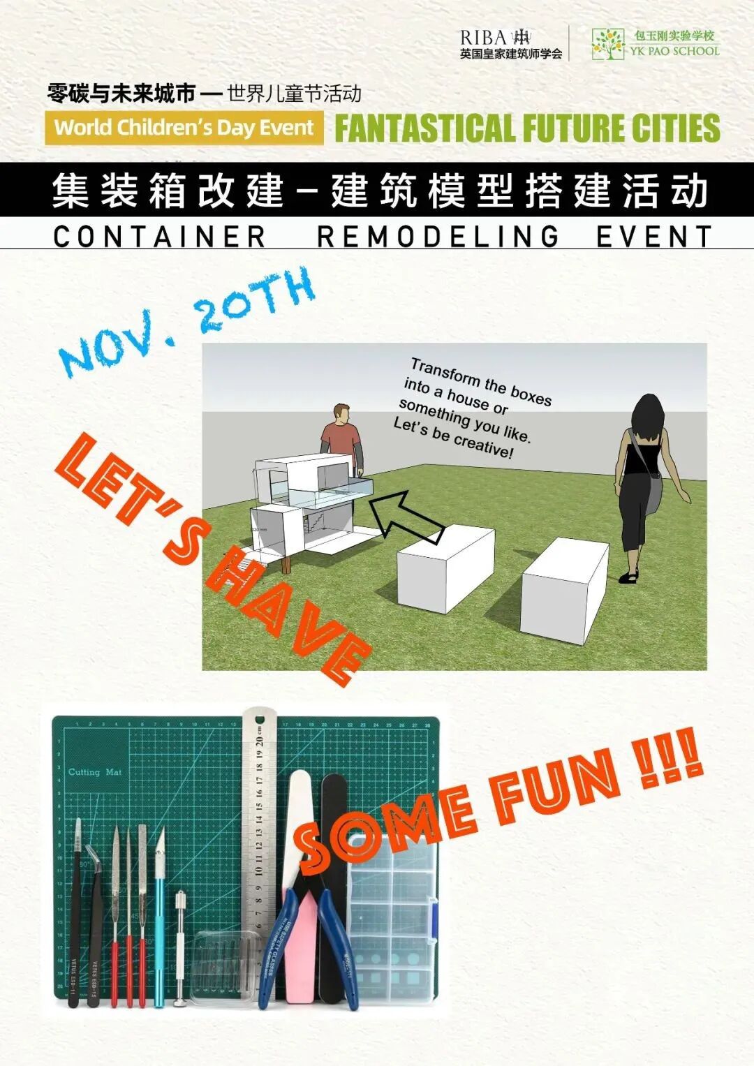 HATCH Architects联合创始人及设计总监卫宏涛先生(David Wei) 作为RIBA China Chapter 委员, 同其他8位RIBA建筑师(韦业启先生、江春先生、Martin Jochman先生、何盛柱先生、张恩苒女士、张若辰先生、Nico Willy先生)作为导师,与30多位初中部的同学共同动手建模,用可回收材料将集装箱改造成未来居所。本次活动旨在让学生更多的了解碳排放所造成的气候问题及其影响。导师们在设计过程中不断启发孩子们创造使用可再生能源、创造能应对海平面上升和其他季候变化挑战的建筑。