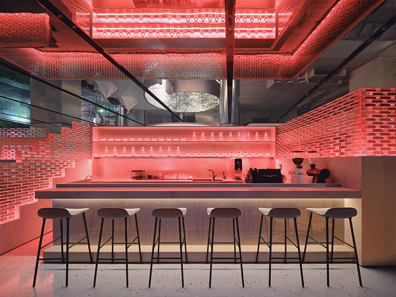 城市舞台以木饰面材料围合,玻璃砖使用构成点睛之笔。这也是我们以当代手法重新诠释成都传统建筑中的青砖石木,与太古里的历史保护建筑遥相呼应。