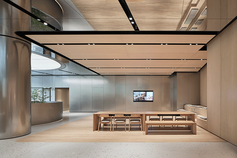 在提升舒适度与温暖感的同时,二层的天花板采用了镜面不锈钢材质的吊顶,以延续并彰显贯穿于品牌基因中的精致、潮流、科技。