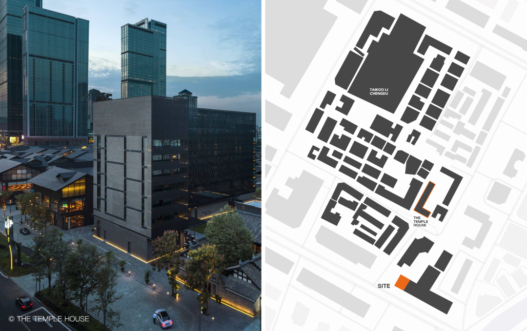 项目位于成都太古里商圈,占据了双面临街的优越位置,交通便利,步行2分钟可达成都博舍酒店。