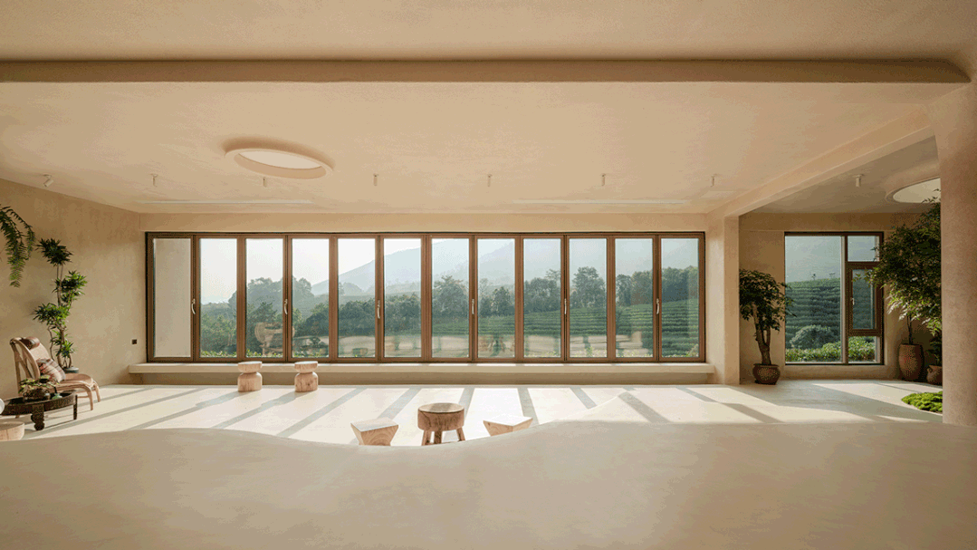 茶室最为突出的亮点之一,是面向茶园的长条形全景落地窗,占据了一整个墙面,像是一个别致的取景框。气候适宜时,横向足有12米的折叠式落地窗可以全部打开,让茶客毫无阻拦地欣赏美景,享受不时吹来清风。