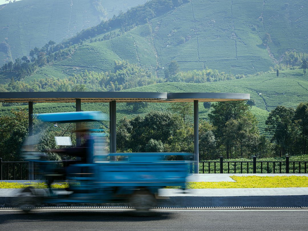 另一座凉亭的顶棚则形似漂浮的云朵,为茶农与游客提供了一隅庇荫纳凉的空间。