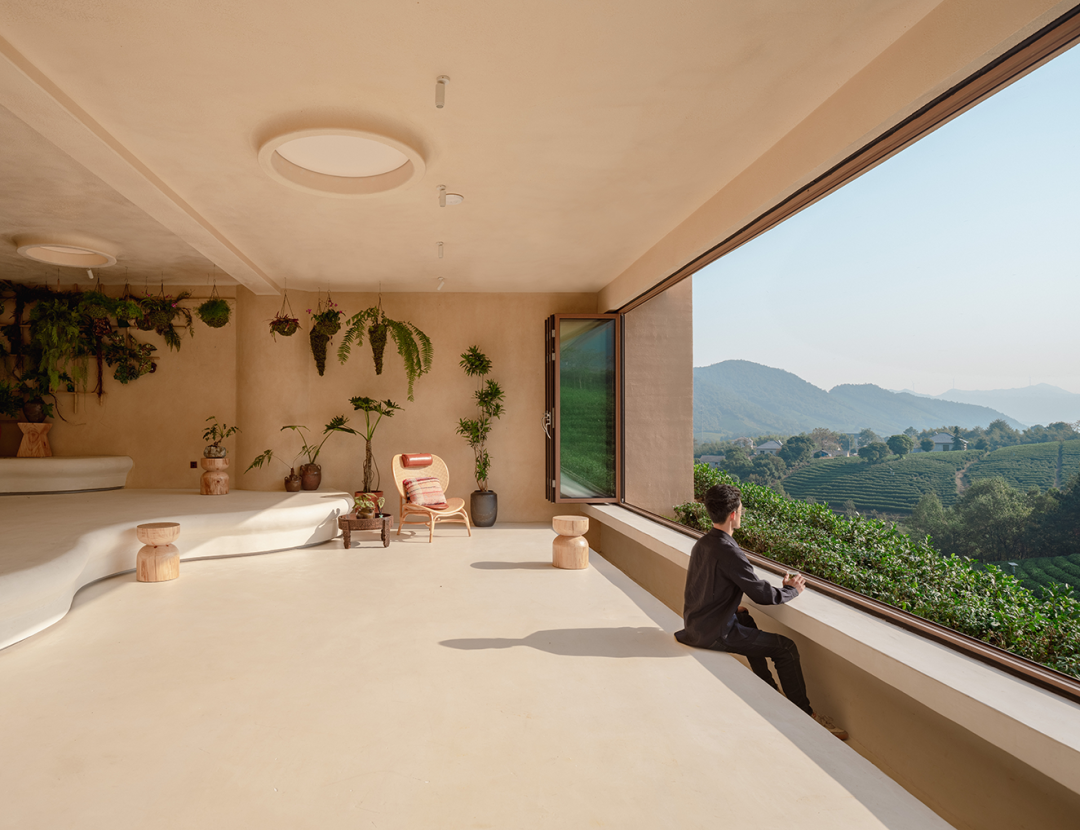 顺应茶园梯田的地理形态,采用嵌入的方法塑造出逐渐下降的茶室。在满足功能需求的同时,通过材料选择、形体塑造等方法弱化建筑的突兀感,与周遭环境融为一体。茶室内部则被打造成了大地色的“洞穴”,室内吧台、台阶的曲线如茶垄般蜿蜒,富有柔软顺滑的质感。