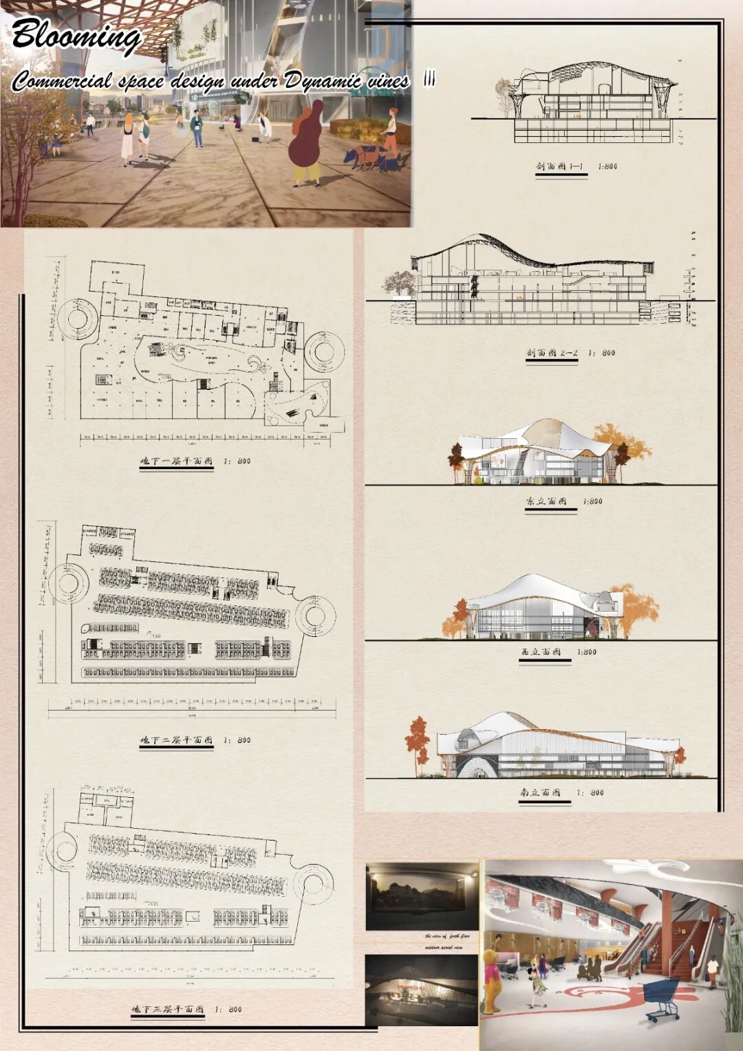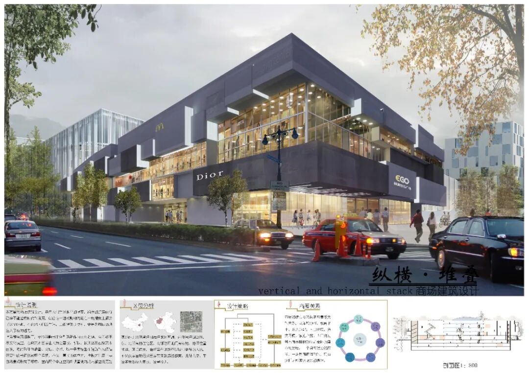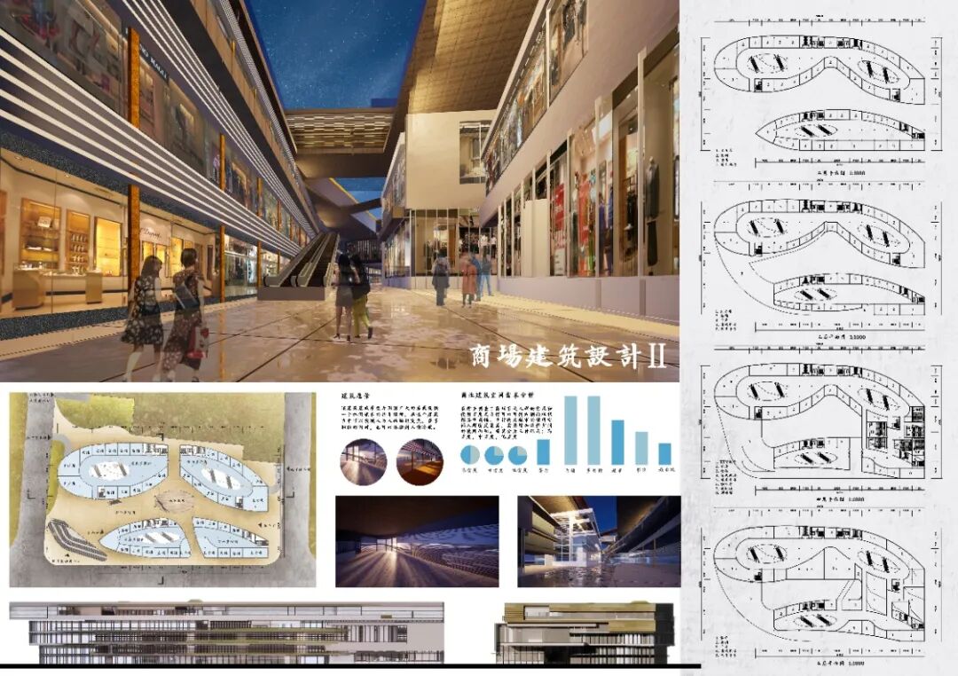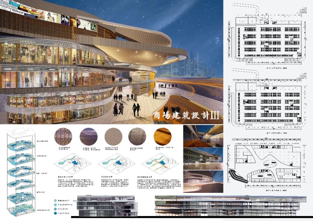 本设计为商场建筑设计,建筑共有八层。地下部分有三层,包括超市、商业街、地下停车场、卸货平台等。地上部分共五层,包括多种购物店面和餐饮娱乐等休闲场所。整体建筑功能合理,流线清晰,建筑立面设计采用了曲面格栅的形式,令其沿垂直于立面的方向上有凹凸变换,从而形成了如同丝绸随风飘动的效果,富有动感。