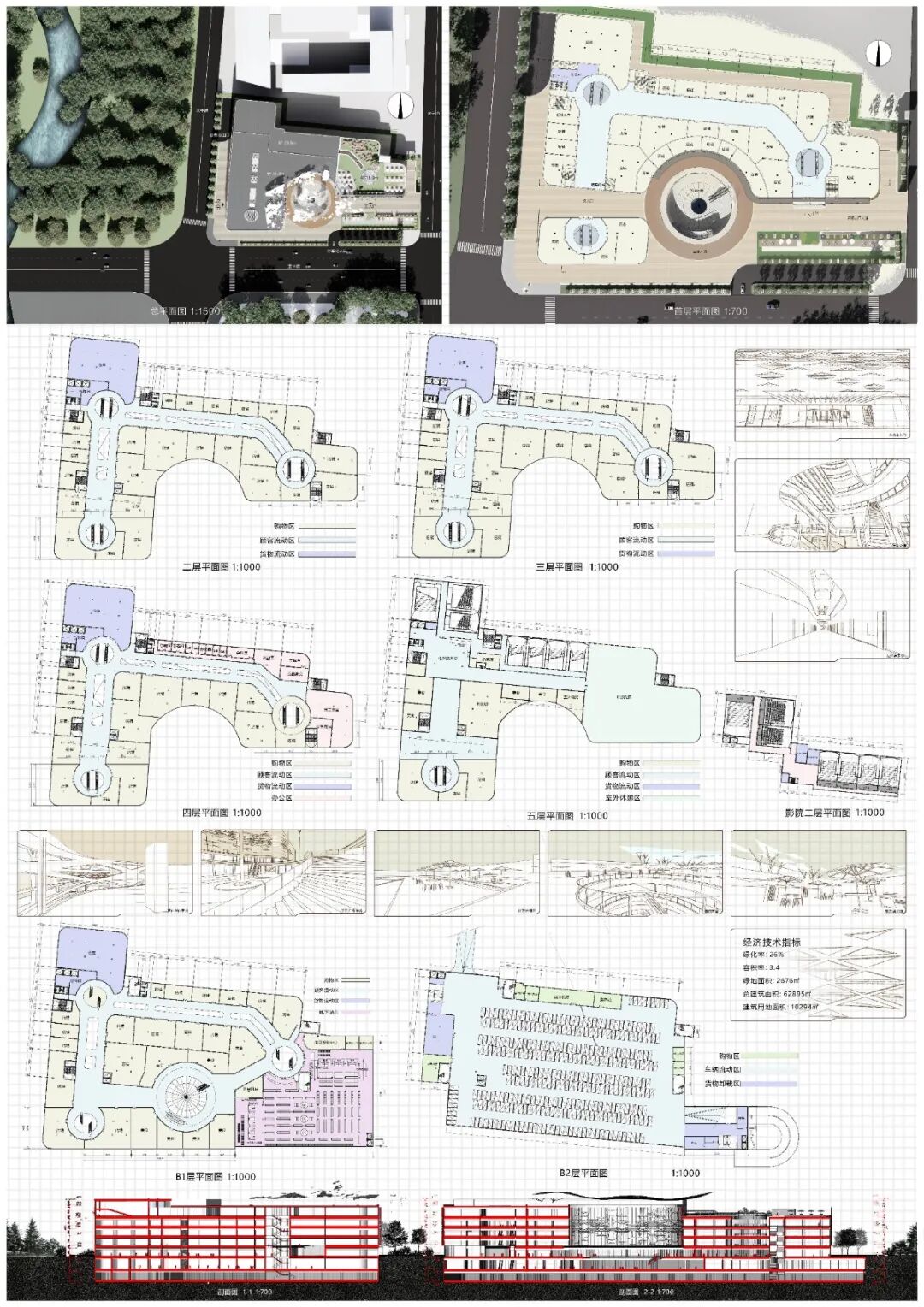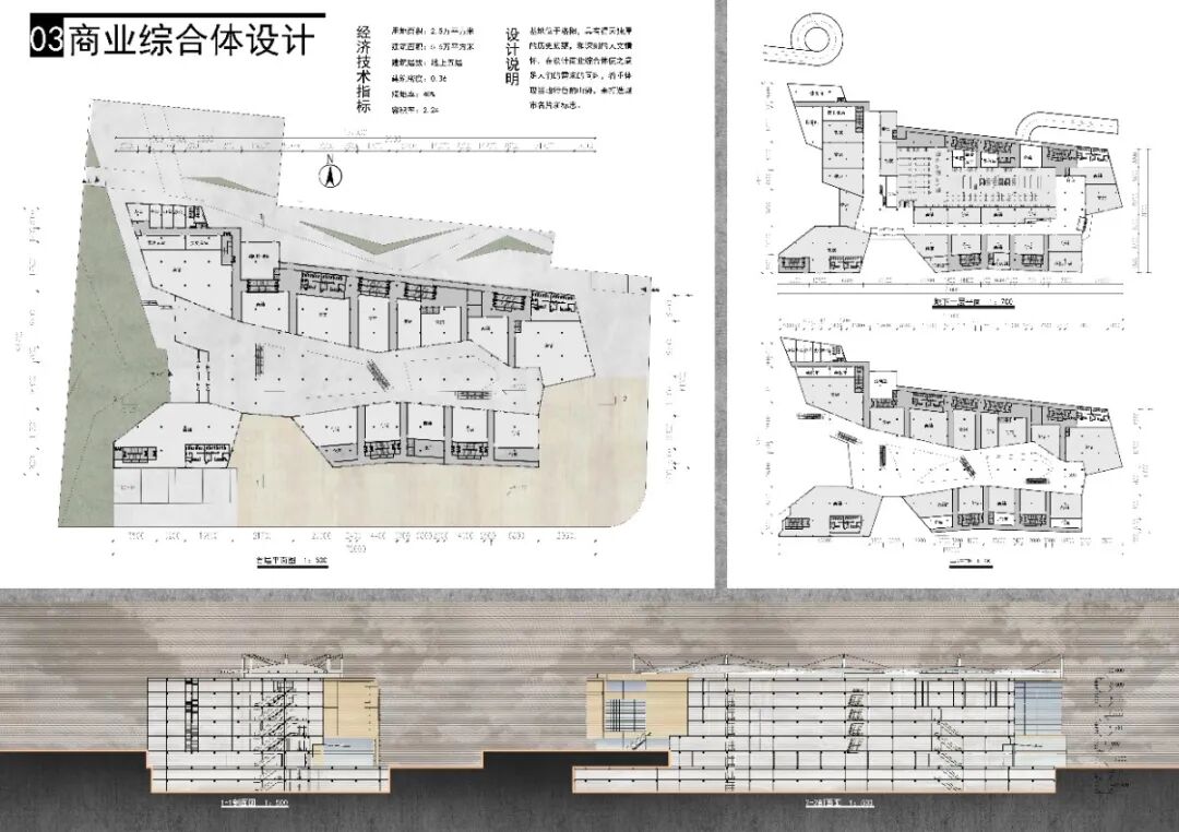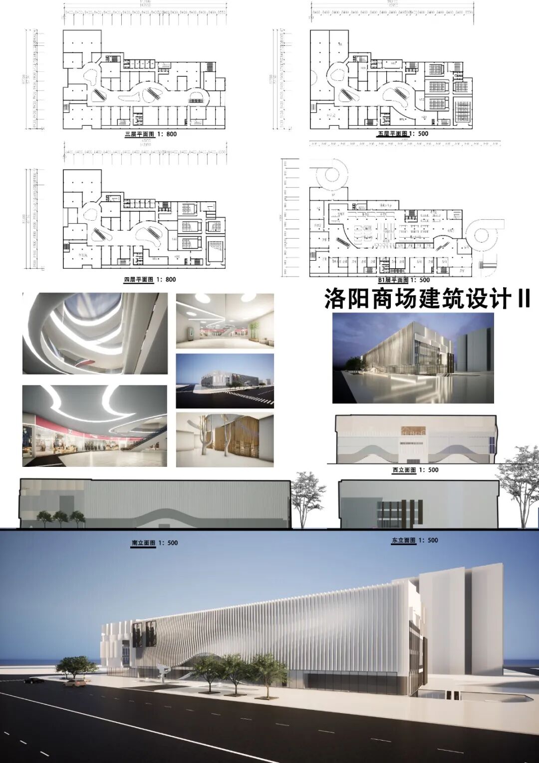 本设计为商场建筑设计,建筑共有八层。地下部分有三层,包括超市、商业街、地下停车场、卸货平台等。地上部分共五层,包括多种购物店面和餐饮娱乐等休闲场所。整体建筑功能合理,流线清晰,建筑立面设计采用了曲面格栅的形式,令其沿垂直于立面的方向上有凹凸变换,从而形成了如同丝绸随风飘动的效果,富有动感。