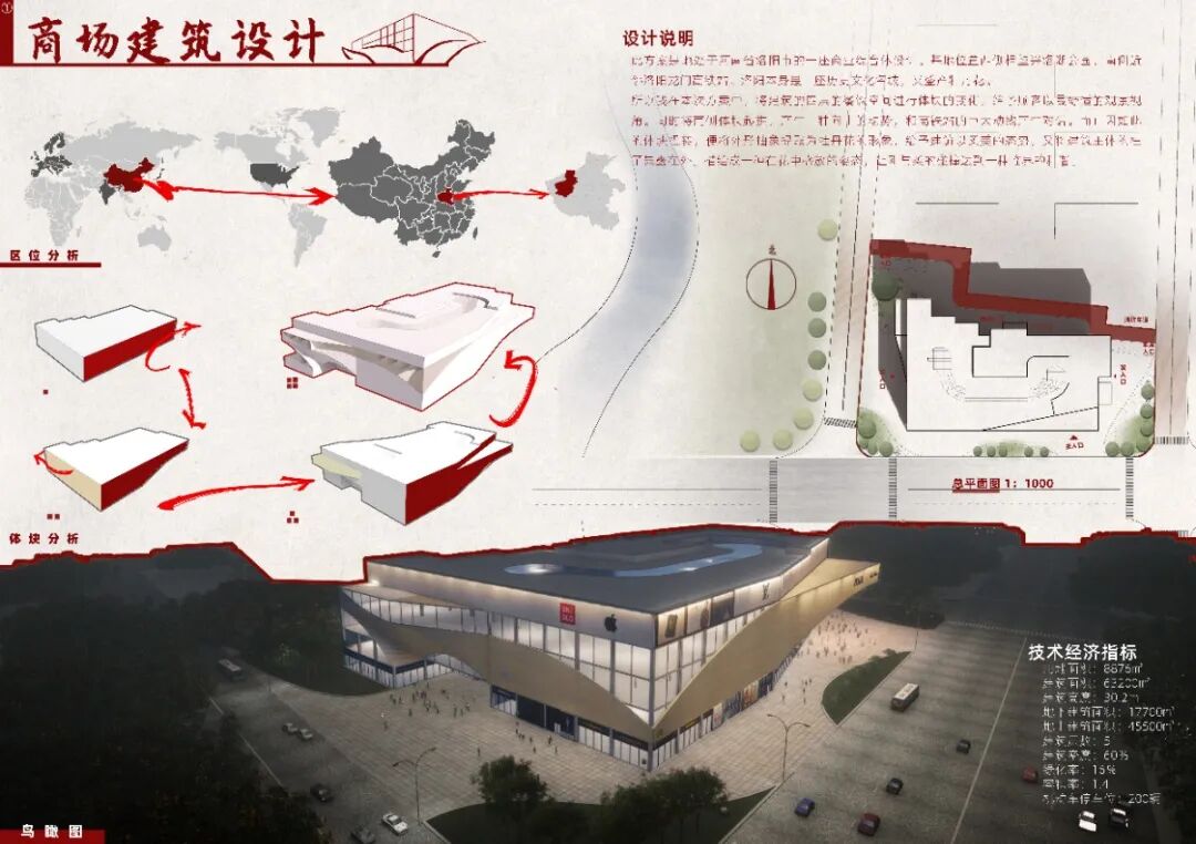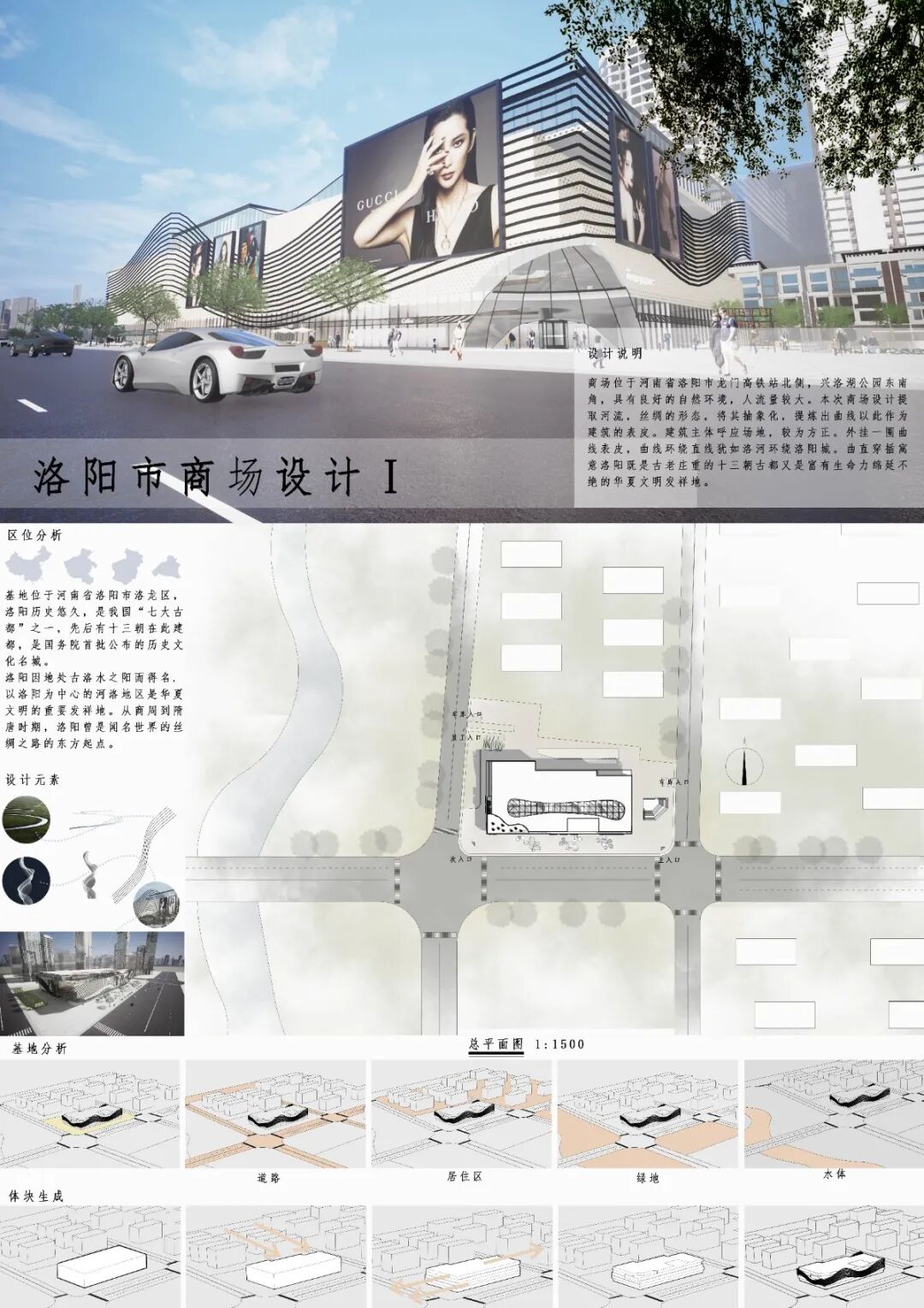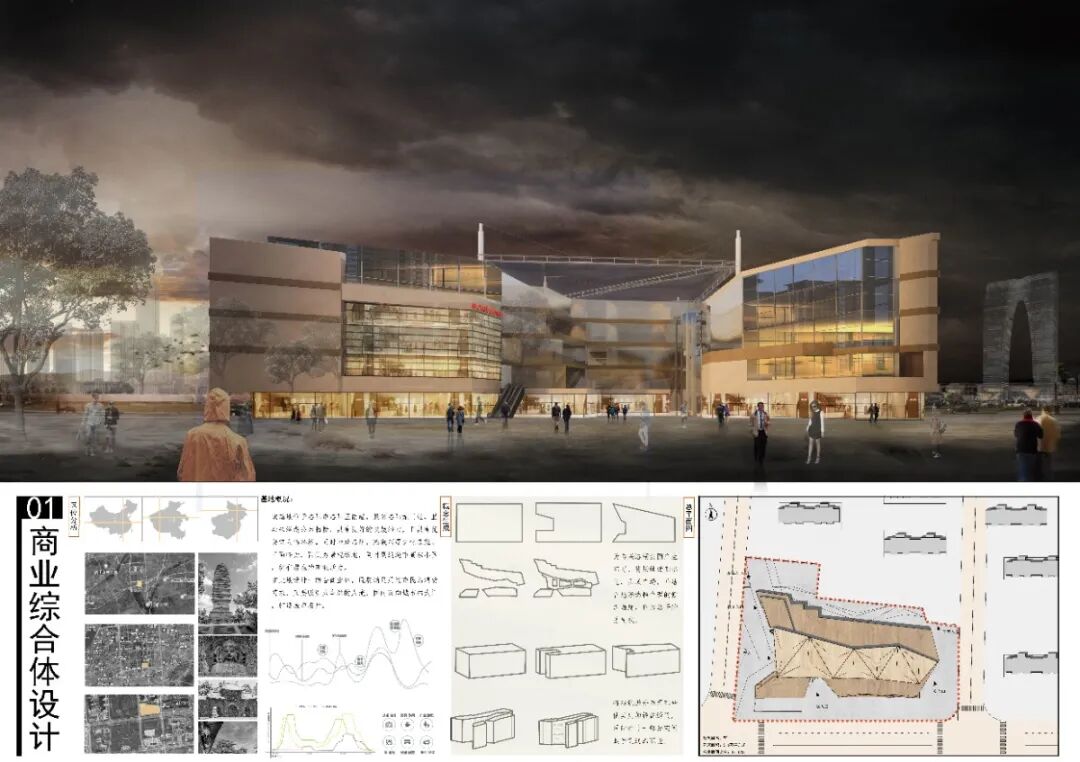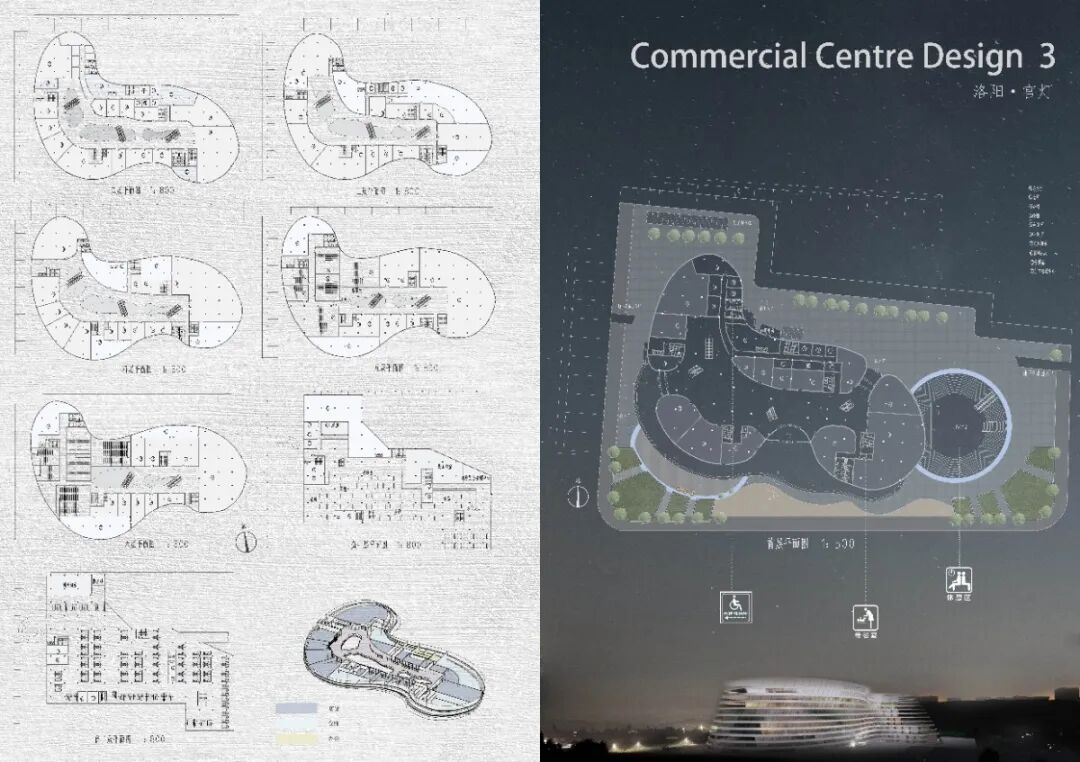 洛阳市是兼具历史的厚重与现代的活力的一个城市,该基地位于兴洛湖东侧,洛阳龙门高铁站北侧,具有良好的商业活力和发展前景,为了使建筑也基地更好的融合,建筑的边界线也场地的参考线采取同样斜度使建筑虽丰富但不至于混乱。将建筑的西侧退让出来,形成城市广场,同时与公园相呼应。