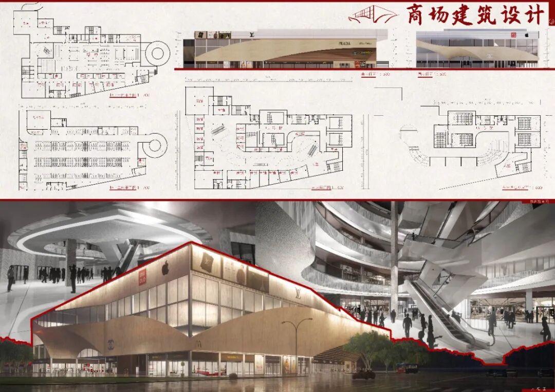 本次商场设计提取洛阳文化中河流,丝绸之路的形态,将其抽象化,提炼出曲线以此作为建筑的表皮。曲直穿插寓意洛阳城既是古老庄重的十三朝古都又是富有生命力绵延不绝的华夏文明发祥地。