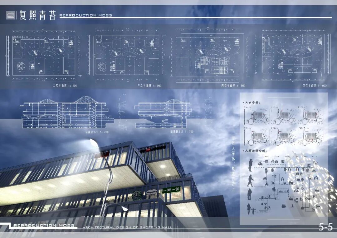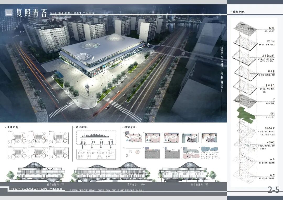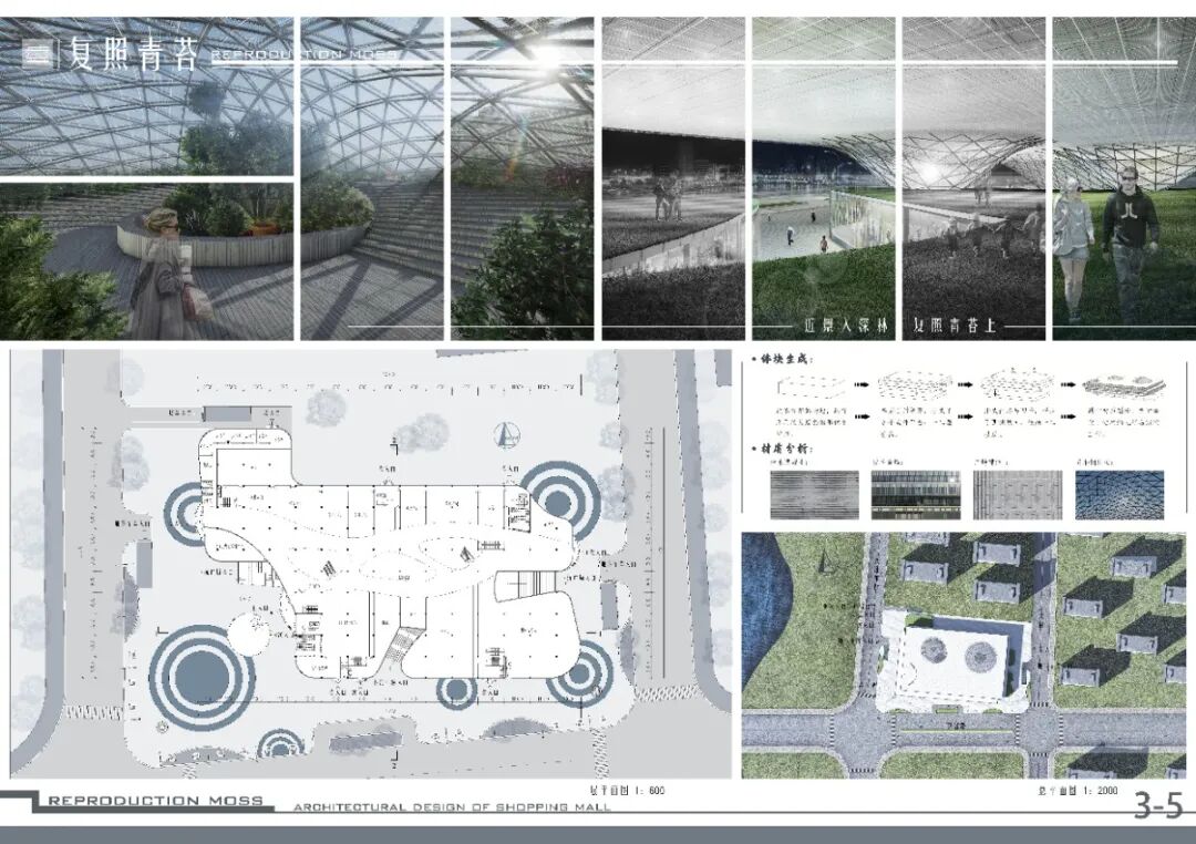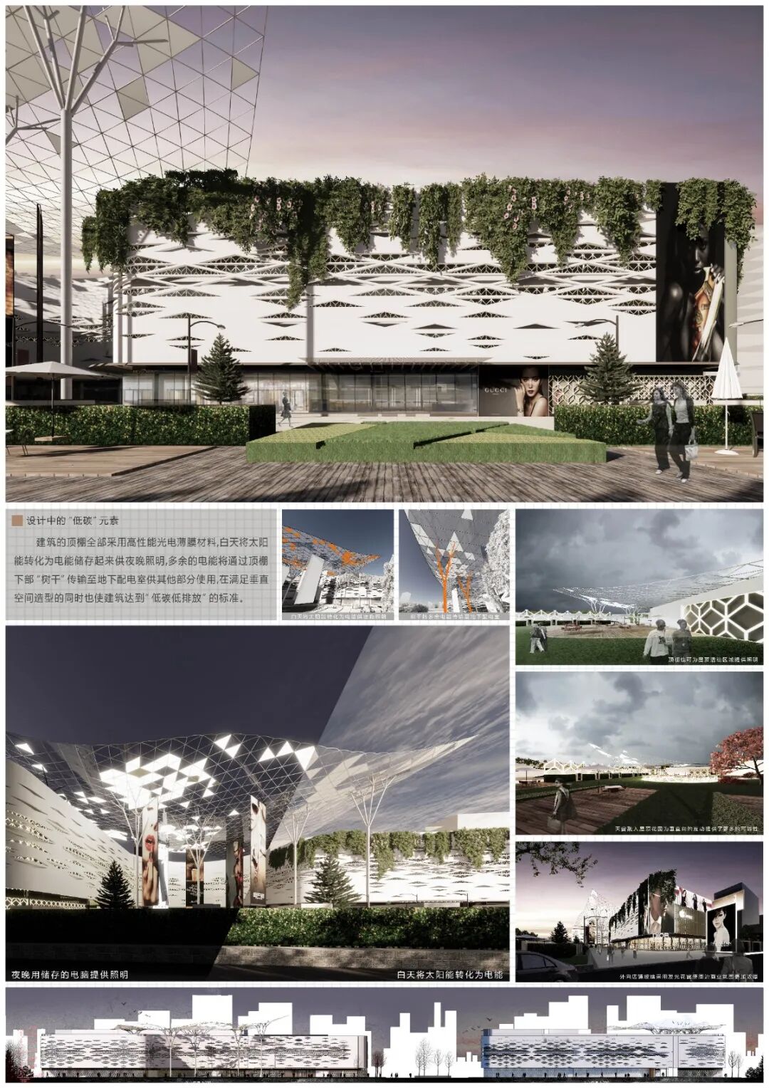 本次商场设计主张营造,围绕性”的室外商业氛围,建筑内部,利用基础的“点”“线”“面”使顾客购物流线清晰且自然;在建筑创新方面,建筑的立面,顶棚,屋顶均结合光电转换技术实现建筑的室内外照明,同时在东侧立面顶部的绿植进一步体现出该建筑绿色、环保、低碳的特点。建筑表皮设计上,由"绿色"联想到"植物"并对植物的”叶子" "枝干”抽象化并结合参数化设计进而形成建筑的表皮,呼应建筑主题。