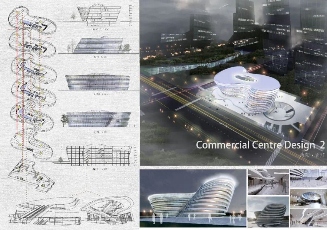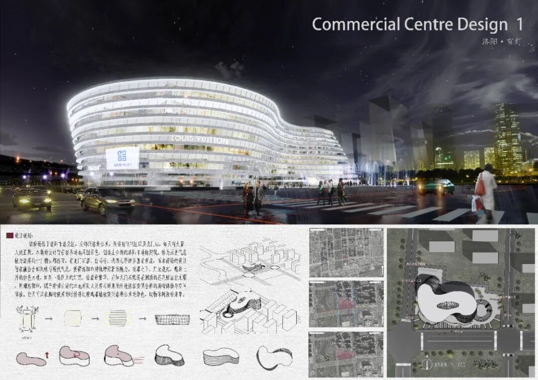 本商场设计旨在联系场地周围景色,引用抽象化的洛阳非遗宫灯元素,创造出全新的洛阳市地标建筑,作为历史气息极为浓厚的13朝古都洛阳,有龙门石窟,白马寺,老君山等诸多景点,而本设计旨在融合古都风味与现代气息,使得洛阳市建筑增添新的魅力。夜幕之下,灯光亮起,螺旋上升的白色大楼,如同一盏巨大的灯笼,轻盈而繁华,一如龙门石窟莲花洞顶的莲花般洁白无瑕,照亮洛阳市,赋予看惯古迹的本地居民以及慕名而来的外地游客全新的购物体验与空间体验。