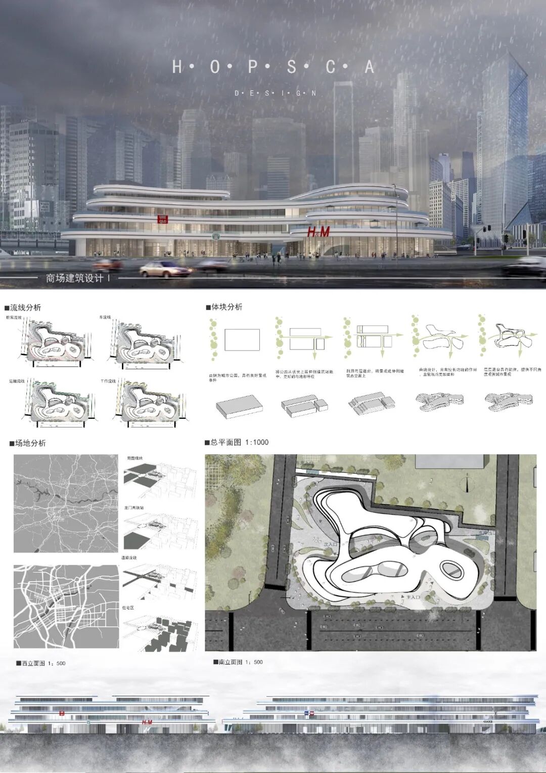 该建筑致力于打造一个现代的、先进的商场来引领城市的发展面貌。采用特殊的黑色模版和流水玻璃形成建筑立面。建筑内部流线环绕,三个中庭连接人流通道。作为亮点的屋顶花园,设想在此摆设咖啡和饰品,人可以在草地上席地而坐,夜晚露营,在音乐里观望城市风光。