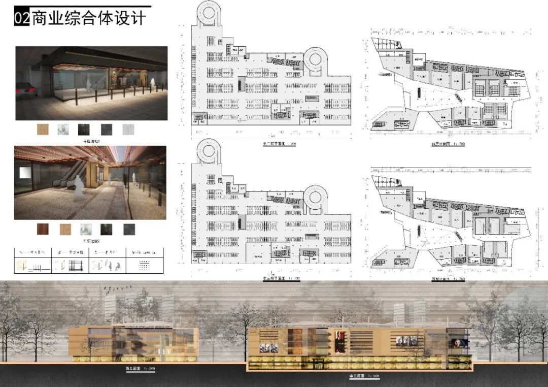 本方案在空间方面,通过律动的曲线中庭提升顾客购物过程中的空间体验;在立面设计上则融合了洛阳龙门石窟的折线元素,采用轻质金属折板进行遮罩,下部辅以灯光,通过光与影、虚与实的碰撞,吸引旅客进入。