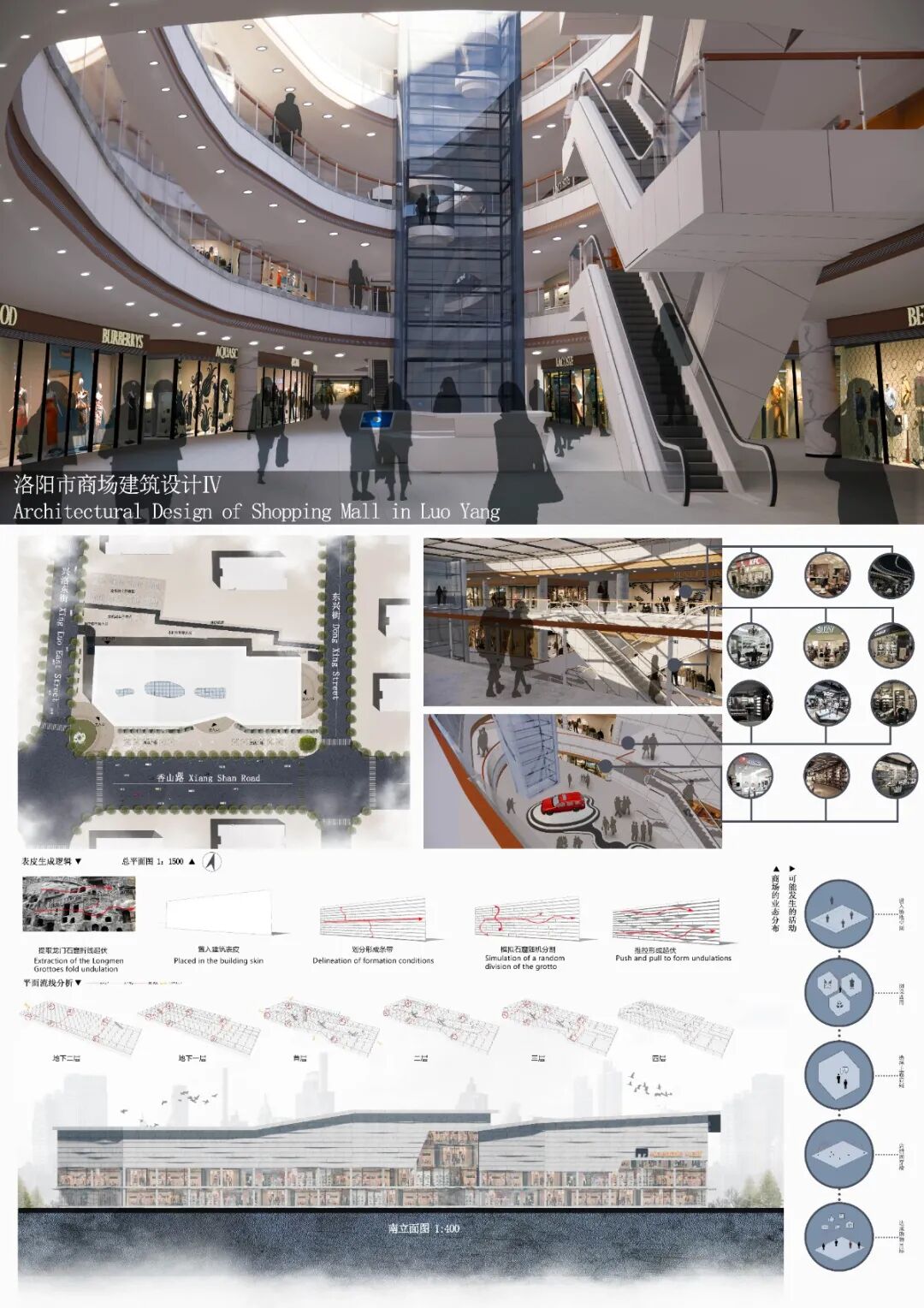 洛阳多山,山石凹凸多变。所以,我通过体块的堆叠、穿插以及一条高低错落贯穿整个建筑的长窗形成外部造型。在内部空间上,以两个不断变化的中庭空间展开购物,达到层与层之间的互通,增加顾客购物体验感。