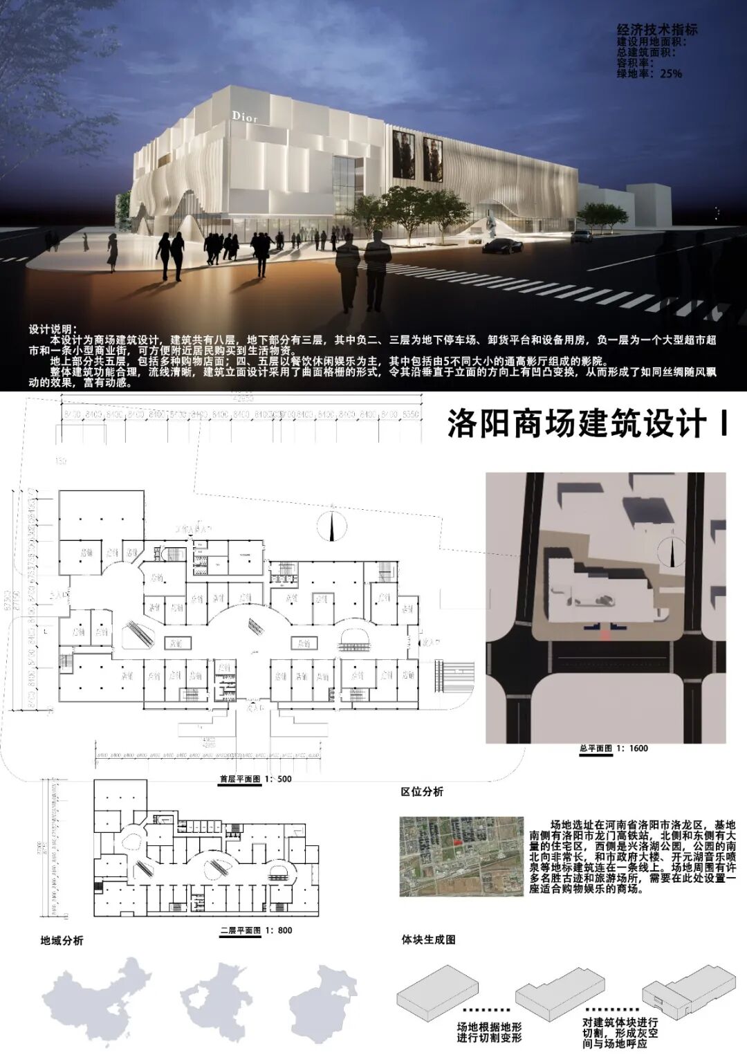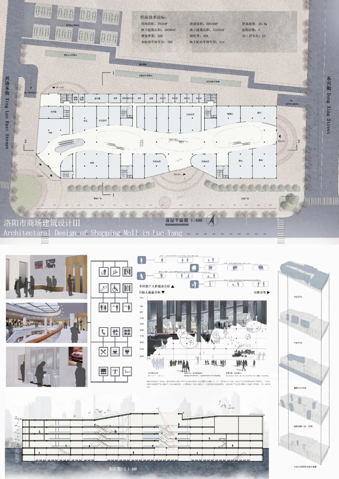 拟在洛阳市龙门高铁站北侧建设商场,见地形图。商场为一站式购物中心,集购物、餐饮、娱乐等多种业态为一体。项目基址核心商圈覆盖大量高级住宅,向南毗邻龙门高铁站,向西毗邻兴洛湖城市公园。总建筑面积为4.5万平方米以上。设计者应深挖洛阳城市历史文化元素,将该建筑打造成洛阳的城市名片。