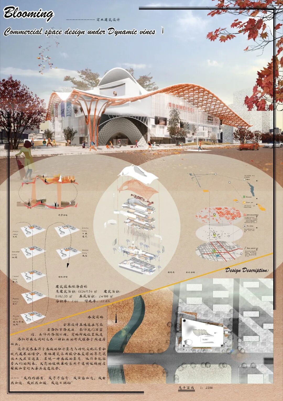 该建筑坐落于历史文化名城洛阳,洛阳作为十三朝古都深厚的文化底蕴,城市中的风土人情都是一抹靓丽的风景线。考虑到这个因素,该方案将巨大体量的商场建筑拆解成四通八达的室外步行街,在将商城的商业价值最大化的同时,也提供了一个周围古城居民交流活动的大型场所,更多体现建筑的人文关怀。同时,建筑的西侧毗邻兴洛湖公园,人们在购物漫步的同时,又可以领略大自然风光的美丽,如此便使得该建筑给顾客带来独特体验。