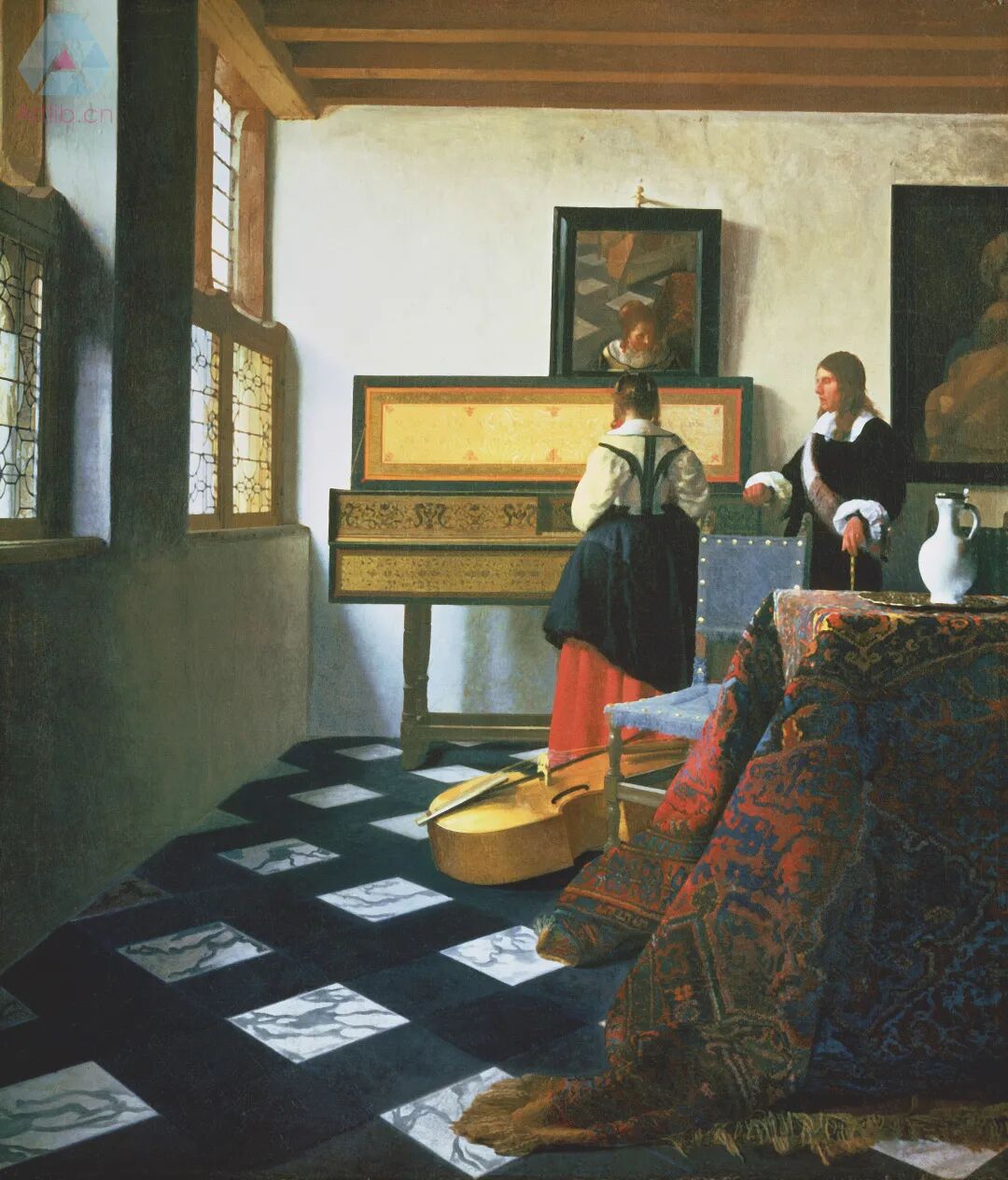 透视:在维米尔的作品中,室内空间的场景出现的频率最高,他也最爱通过格子的地板暗示出空间感
