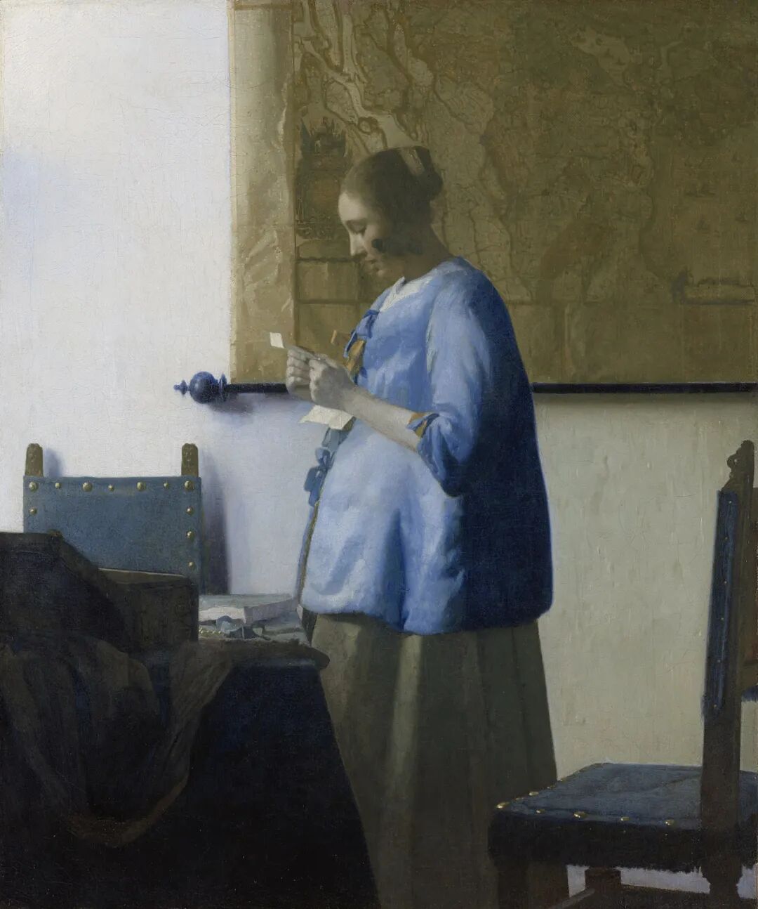 维米尔的绘画具有瞬间与永恒的特点,这绝不是一个自相矛盾的说法,按照孙乃树老师的说法就是他把人物画出了静物般的感觉,刹那成永恒想必也不过如此吧