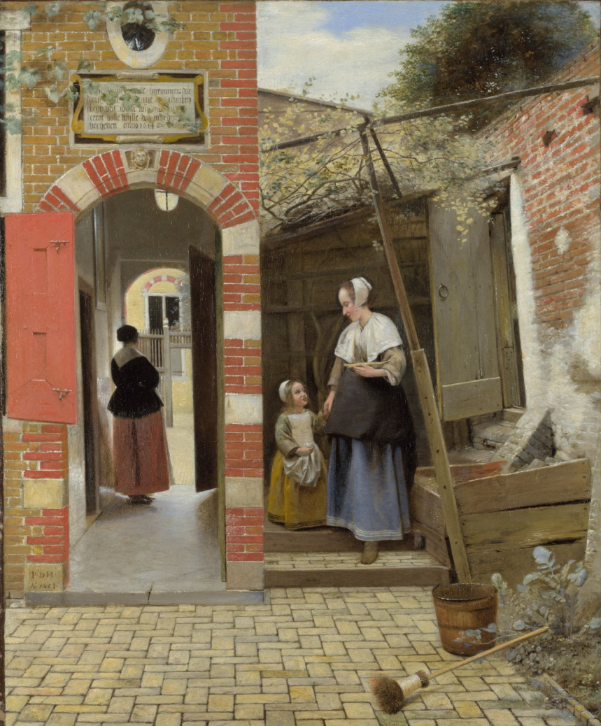 光线:在他的画中,虽然我们看不到具体的光源在何处、比如太阳、台灯、蜡烛等在哪,但我们却能感受到从窗户出照射进来的光线,而且这种光线打在人物身上、显得非常地柔和,仿佛蒙上了一层淡淡的光晕。
